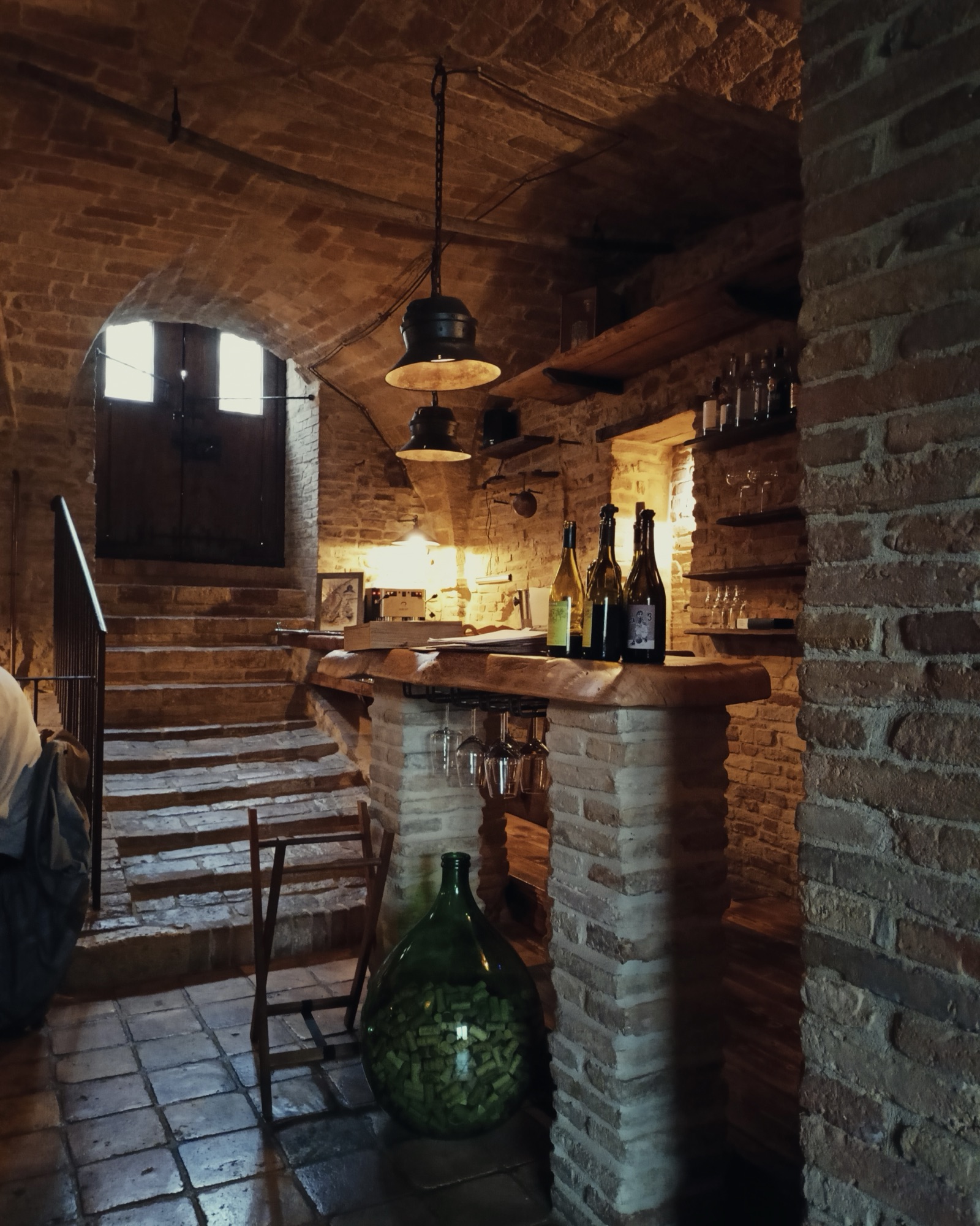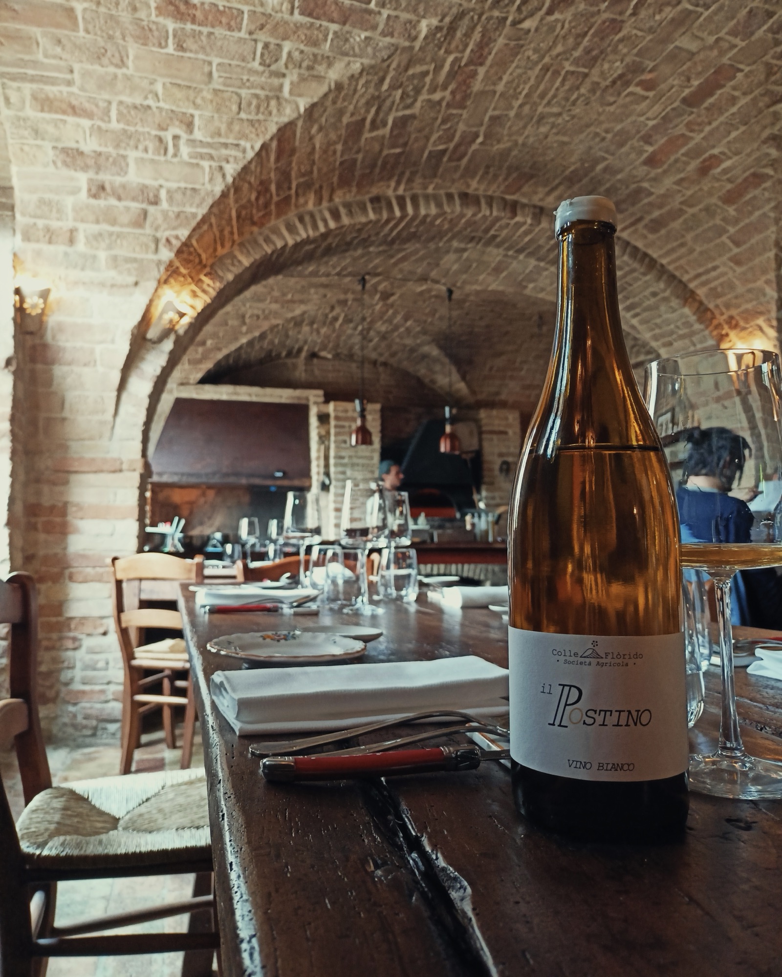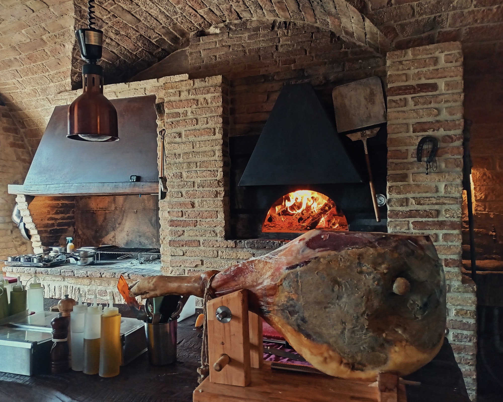 Il locale si sviluppa in due splendidi spazi interni in mattoni a vista, con volte a crociera. Il nostro tavolo è nella sala condivisa con il camino e la griglia a brace viva. Ci godiamo lo spettacolo tra un boccone e un sorso di vino. Ci spiegano che solo i primi vengono preparati in cucina, mentre tutto il resto passa dal fuoco, con una cottura attenta che evita il contatto diretto con la fiamma.