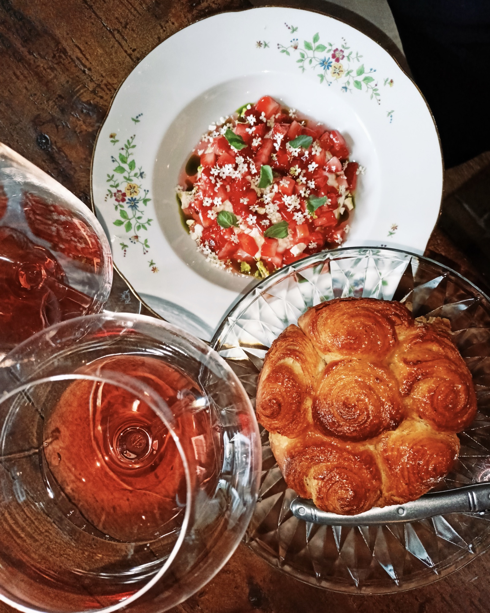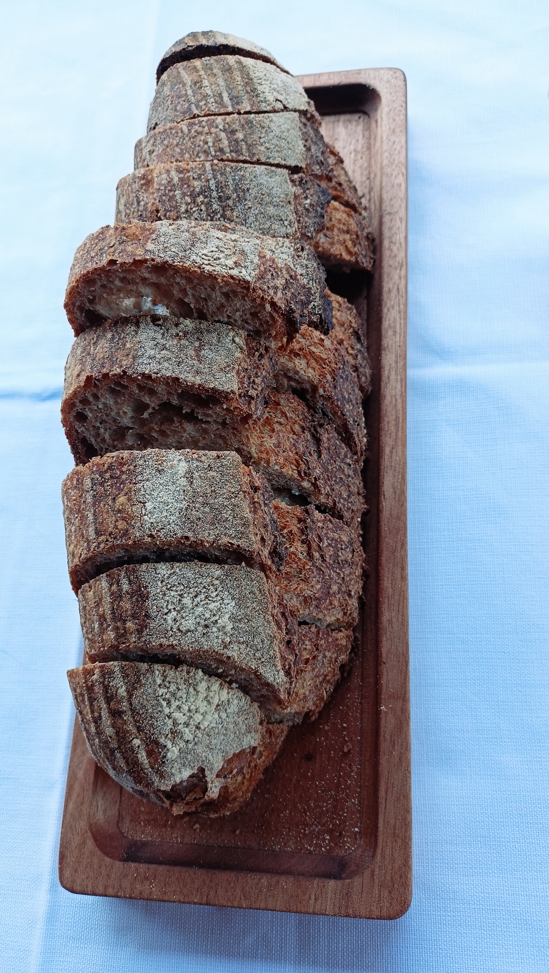 Prima ancora di assaporare la squisita materia prima delle varie portate, eccolo arrivare trionfante con una grande pagnotta di lievito madre servita su un tagliere di legno. La polverizziamo in due minuti. Litigandoci pure le briciole.