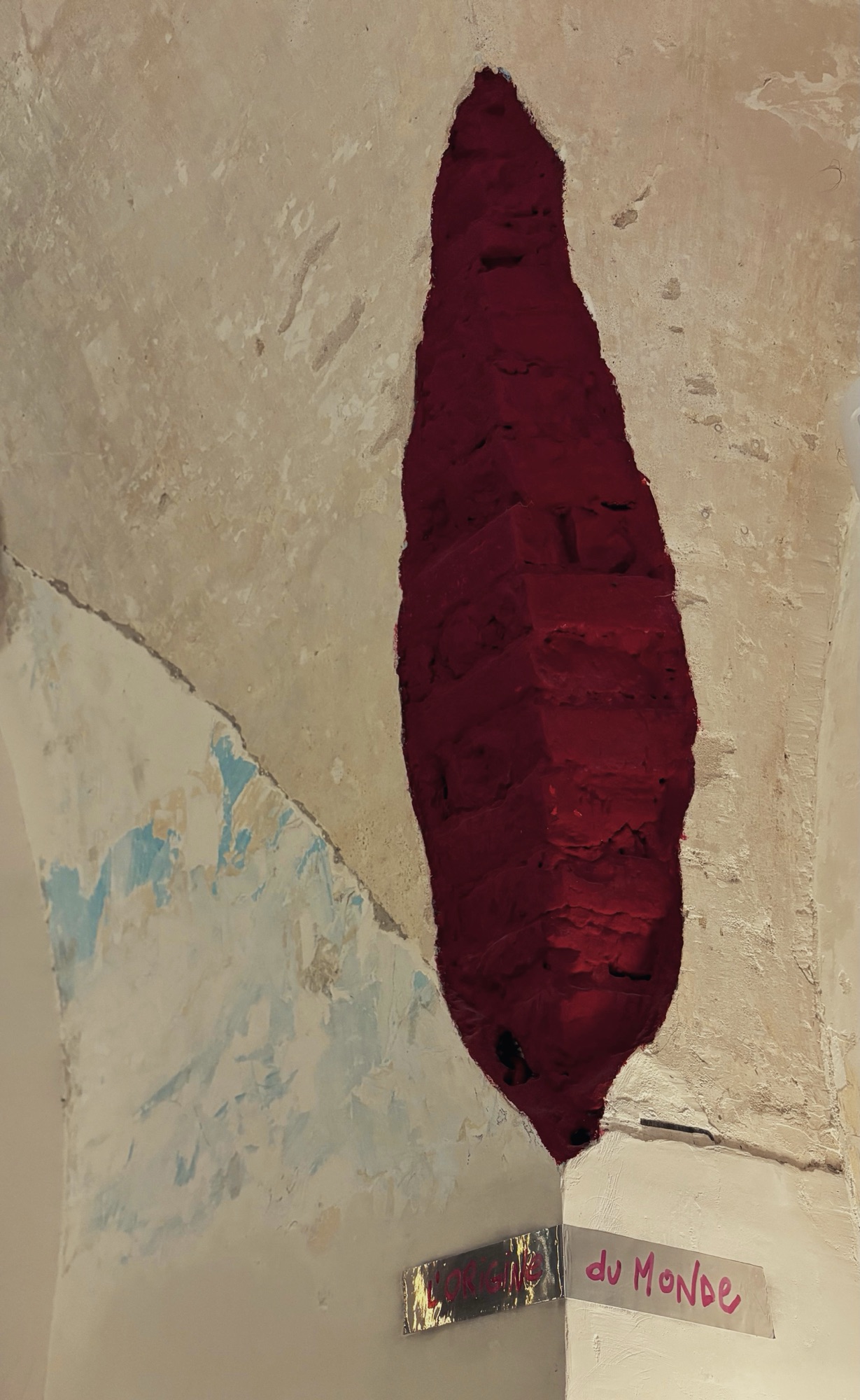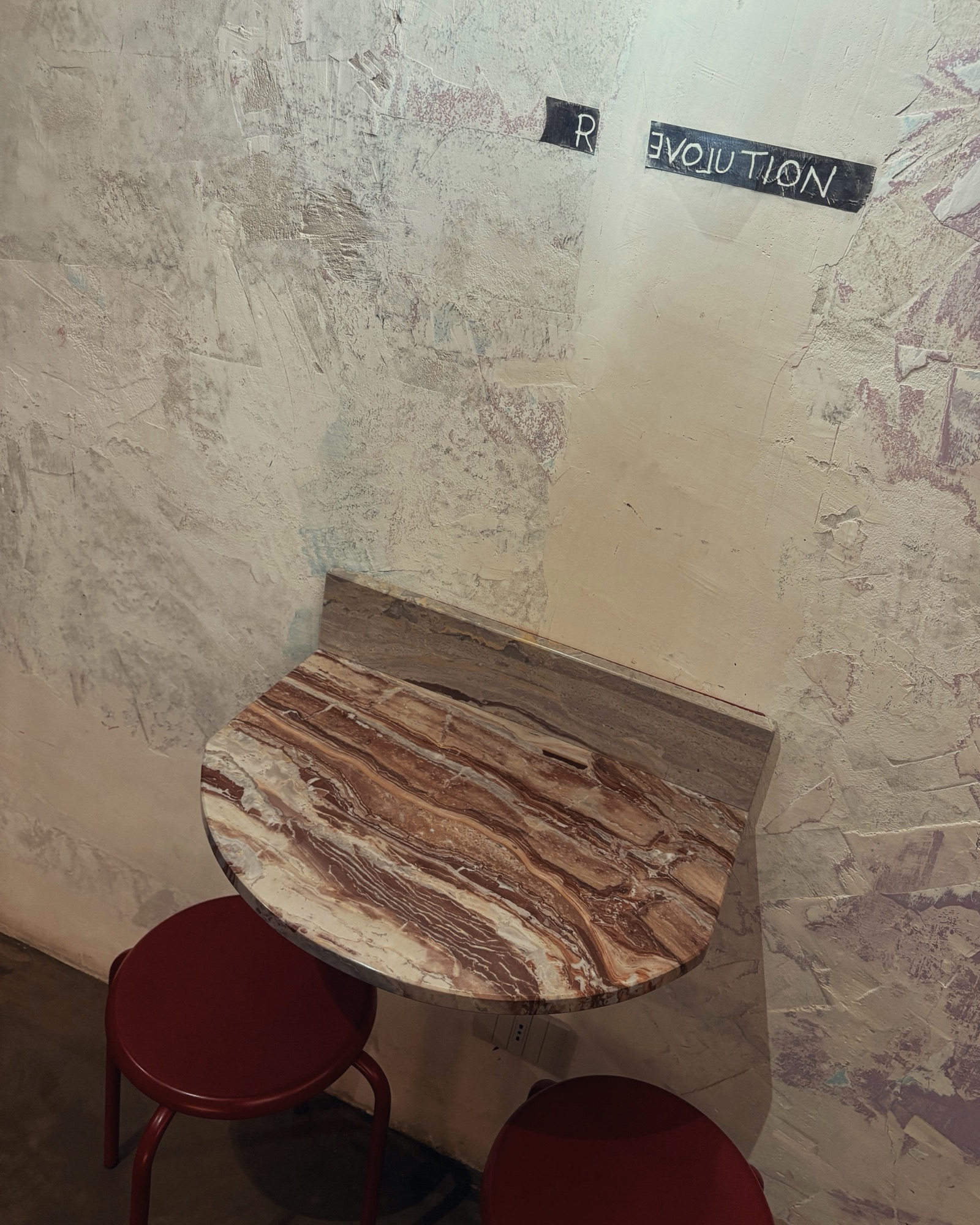 L’ambiente è figo sul serio: pareti scrostate, neon, ripiani dei tavoli in pietra naturale uno diverso dall’altro e bizzarre opere d’arte che sembrano lì apposta per spiazzarti.