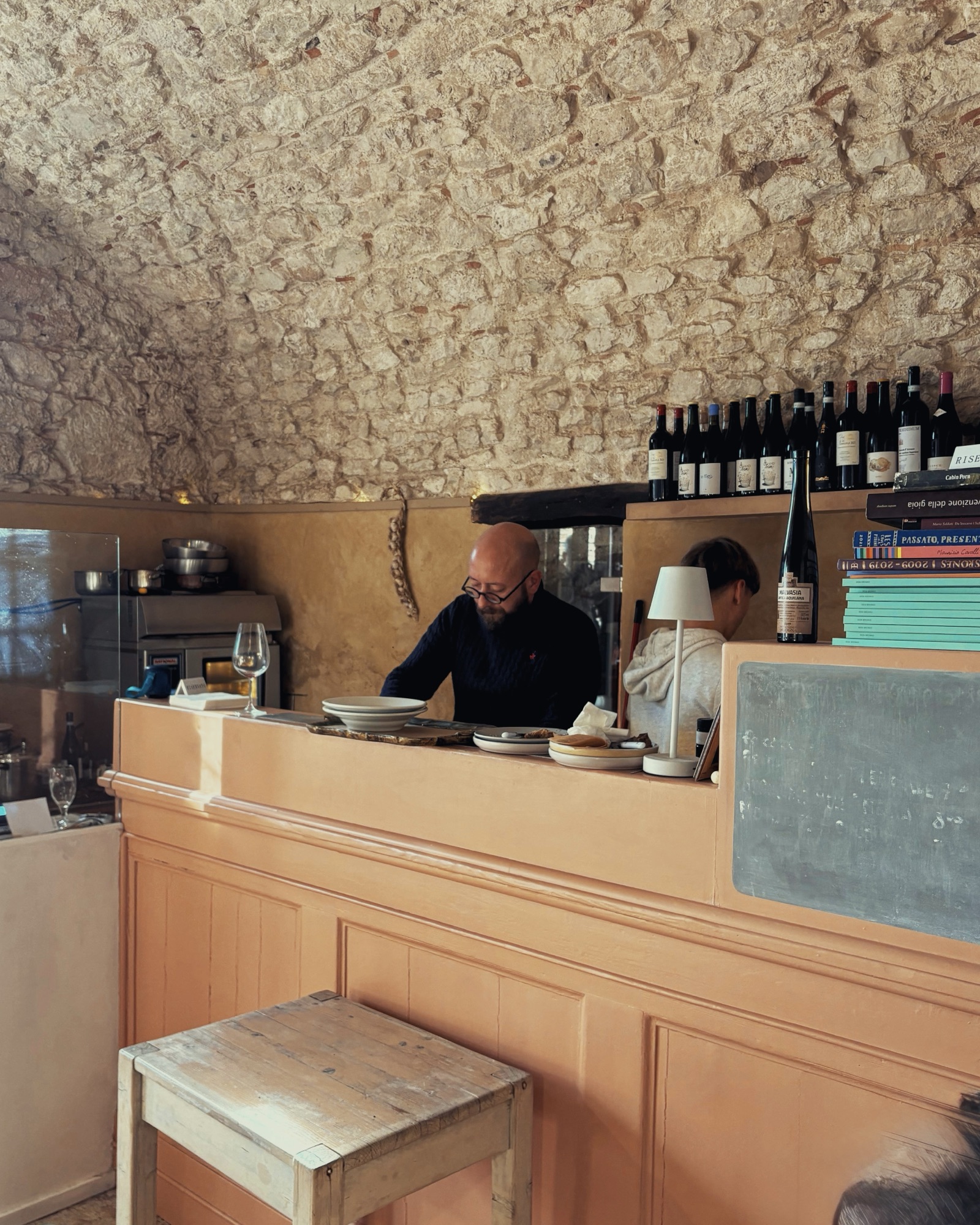 Entriamo. L’ambiente è piccolo, raccolto, interamente in pietra. L’arredamento è minimale, pensato e realizzato da Velia, compagna di Paolo, restauratrice e interior designer. Insomma, tutto è misurato, senza nulla che alzi la voce: un rifugio dove rallentare per ricaricarsi viene naturale.