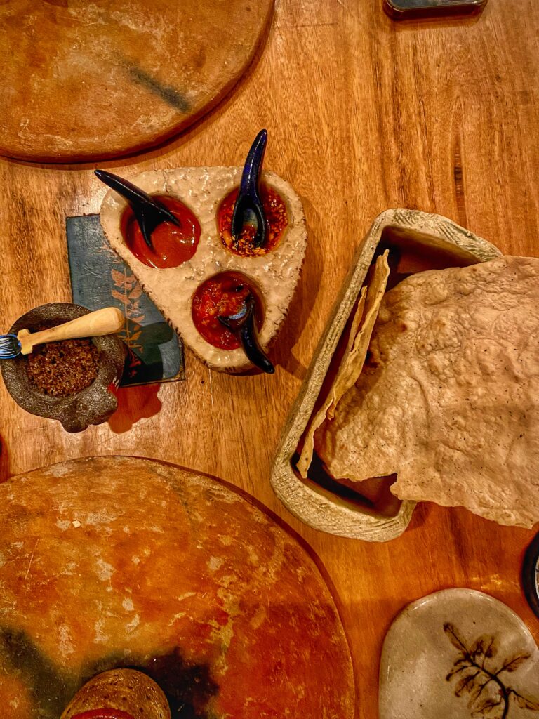 Tostadas de maíz criollo, salsas y sal aromatizado al almoraduz