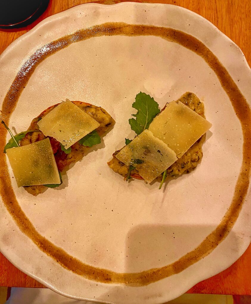 Pan pita hecho en casa, tichindas, ostiones ahumados, jocoque, berenjena, arugula y queso Pecorino