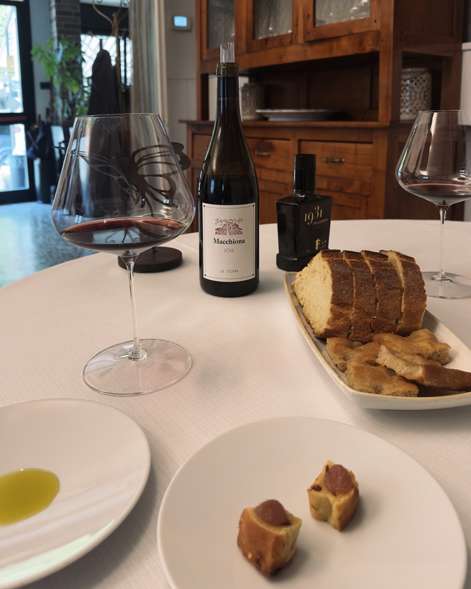 L’inizio, pane, focaccia e olio, la Macchiona 2016 de La Stoppa