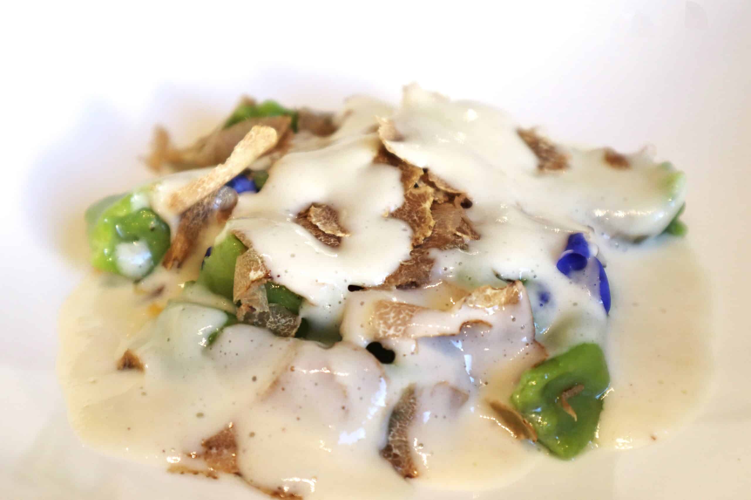 Ravioli del plin con borragine e ortica, finferli trifolati , tartufo bianco d’Alba e salsa al gorgonzola affinato nell’uvetta. La sous chef ci scherza su avvisandomi che dimenticano sempre il bricchetto sul tavolo. Per fortuna! Non ne ho lasciato una goccia. L’insieme degli ingredienti risulta davvero armonioso nonostante la presenza del gorgonzola