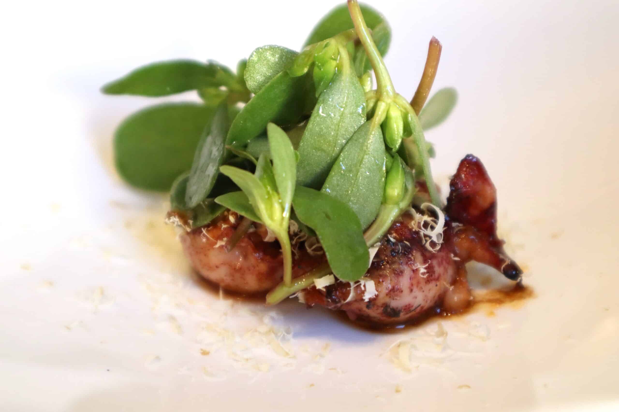 Calamaretto spillo ripieno, caldarroste e portulaca.
