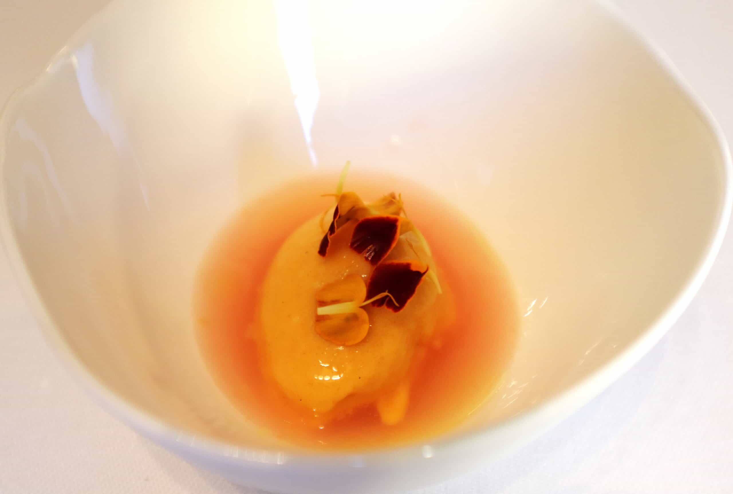 Gamberi rosa del mar Ligure con lardo di colonnata, olio di sesamo affumicato e acqua di pomodoro fermentata. Una partenza sprintosa giocata tra la dolcezza del gambero, l’acidità del pomodoro, la grassezza e rotondità del lardo e una leggera nota amaricante dei semi di sesamo