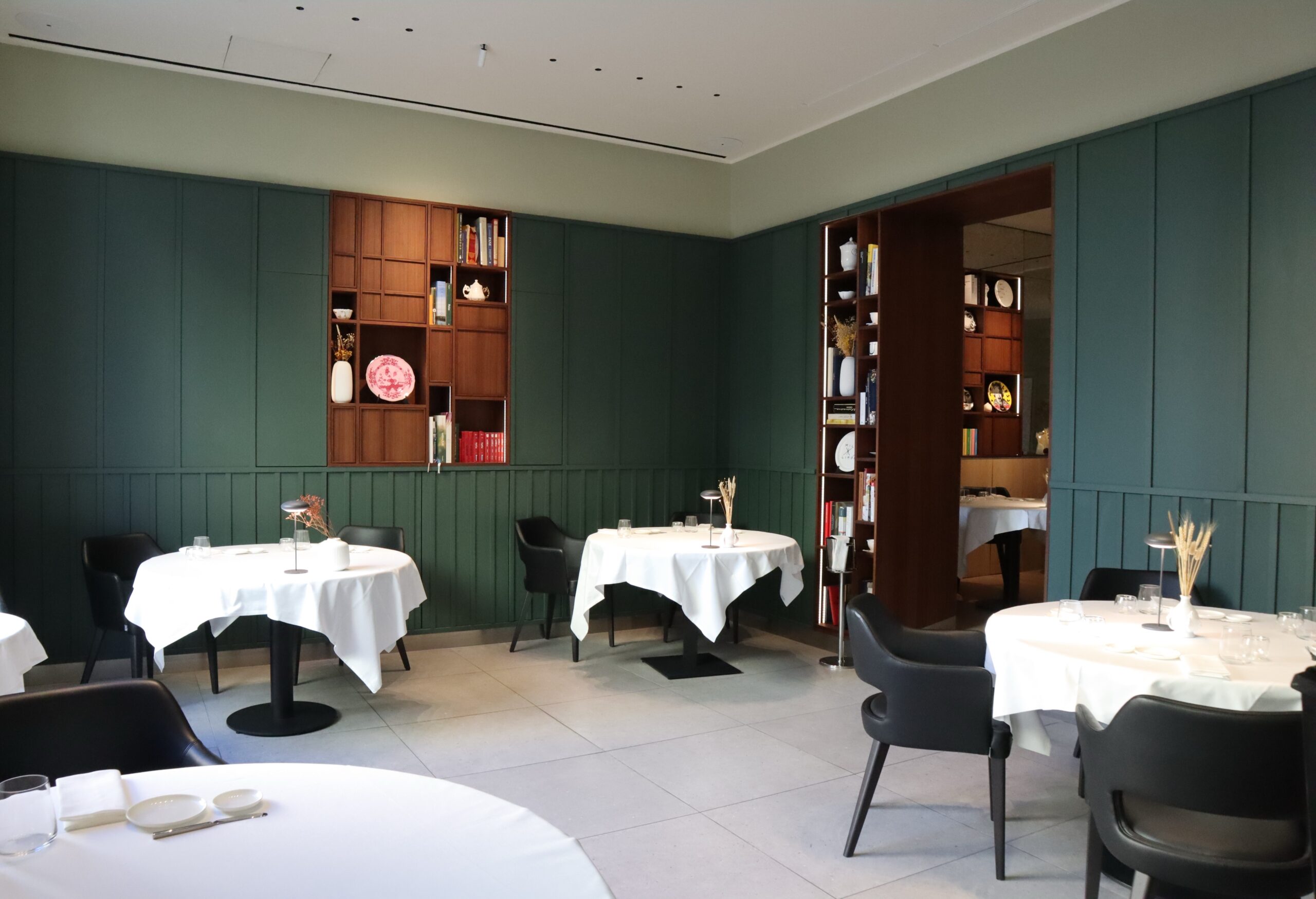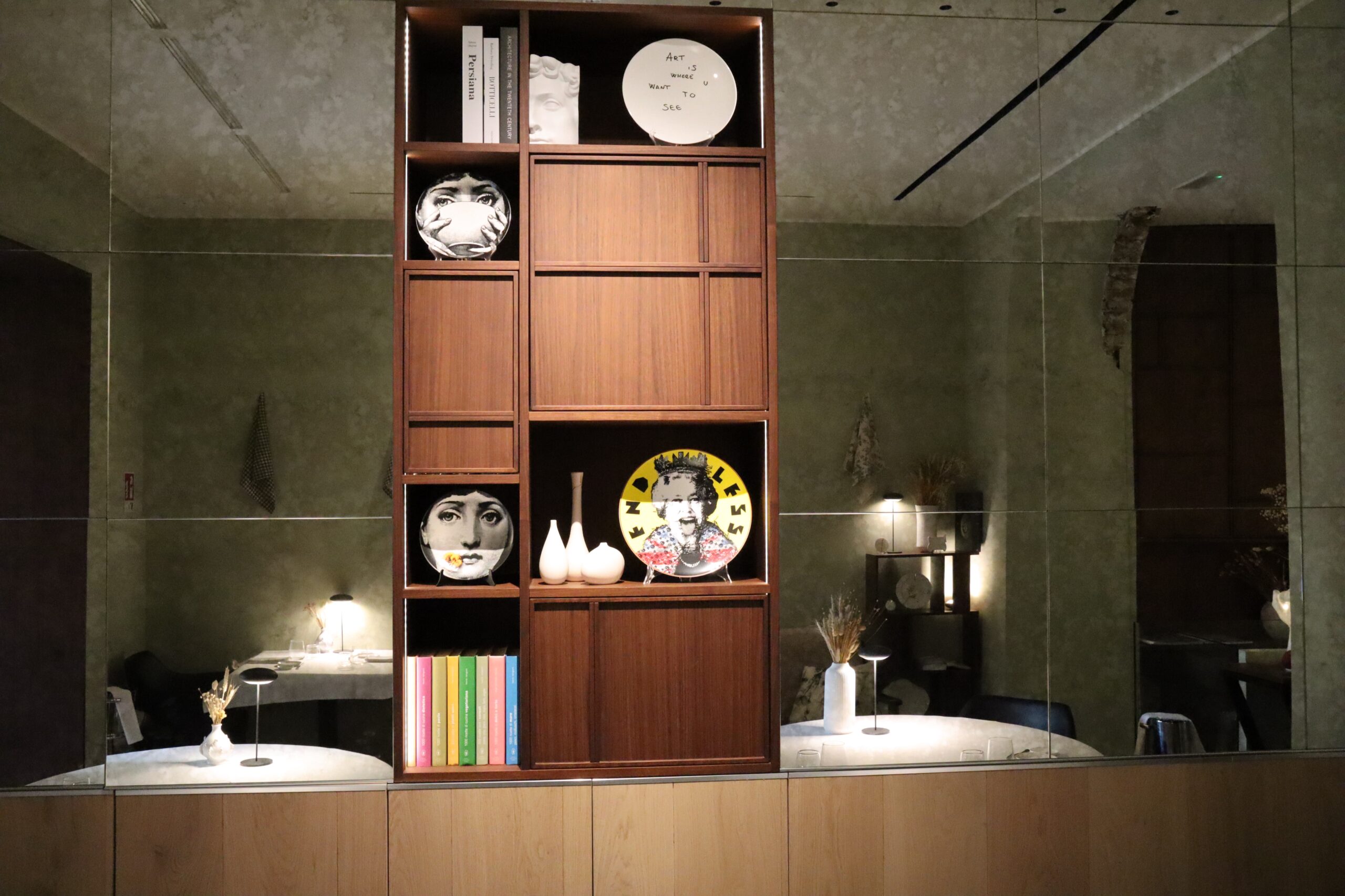 Si entra passando immediatamente dalla cucina a vista, tra acciaio, legno e marmi toscani, e lo spazio continua in una sala dai bellissimi toni del verde della boiserie in legno. Proseguendo a destra ci si trova nella sala degli specchi vintage, tra soffici poltroncine, libri, sculture, oggetti di design e ceramiche. Infine un’accogliente saletta, situata in fondo al corridoio, è dedicata agli eventi privati. Sparsi per tutto il ristorante, appesi alle pareti, scendono dei bellissimi teli, una delle più recenti tendenze dell’arte italiana. Insomma, gli interni progettati dallo stesso chef con il fine di creare un ambiente intimo, una vera casa, appaiono davvero curatissimi!