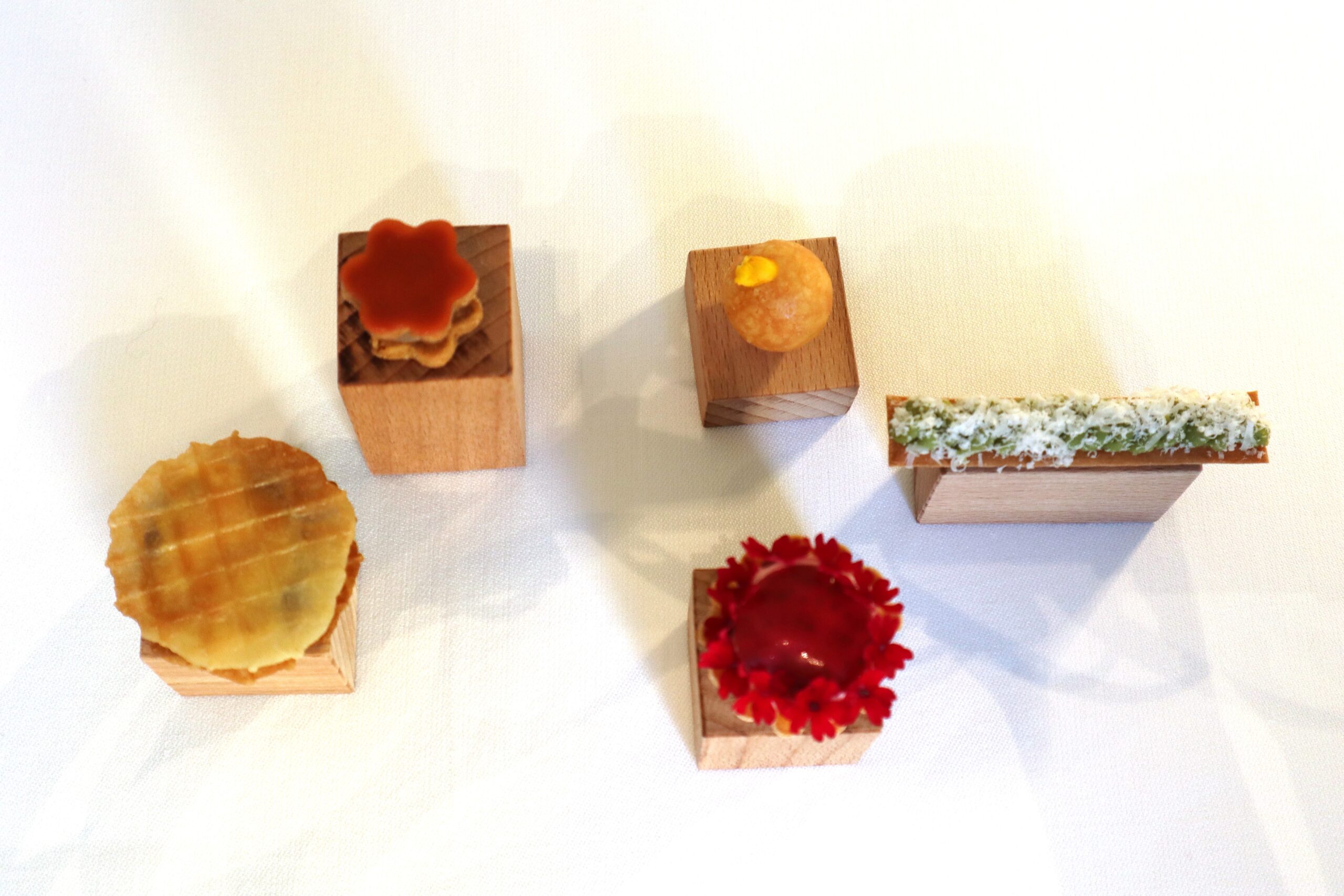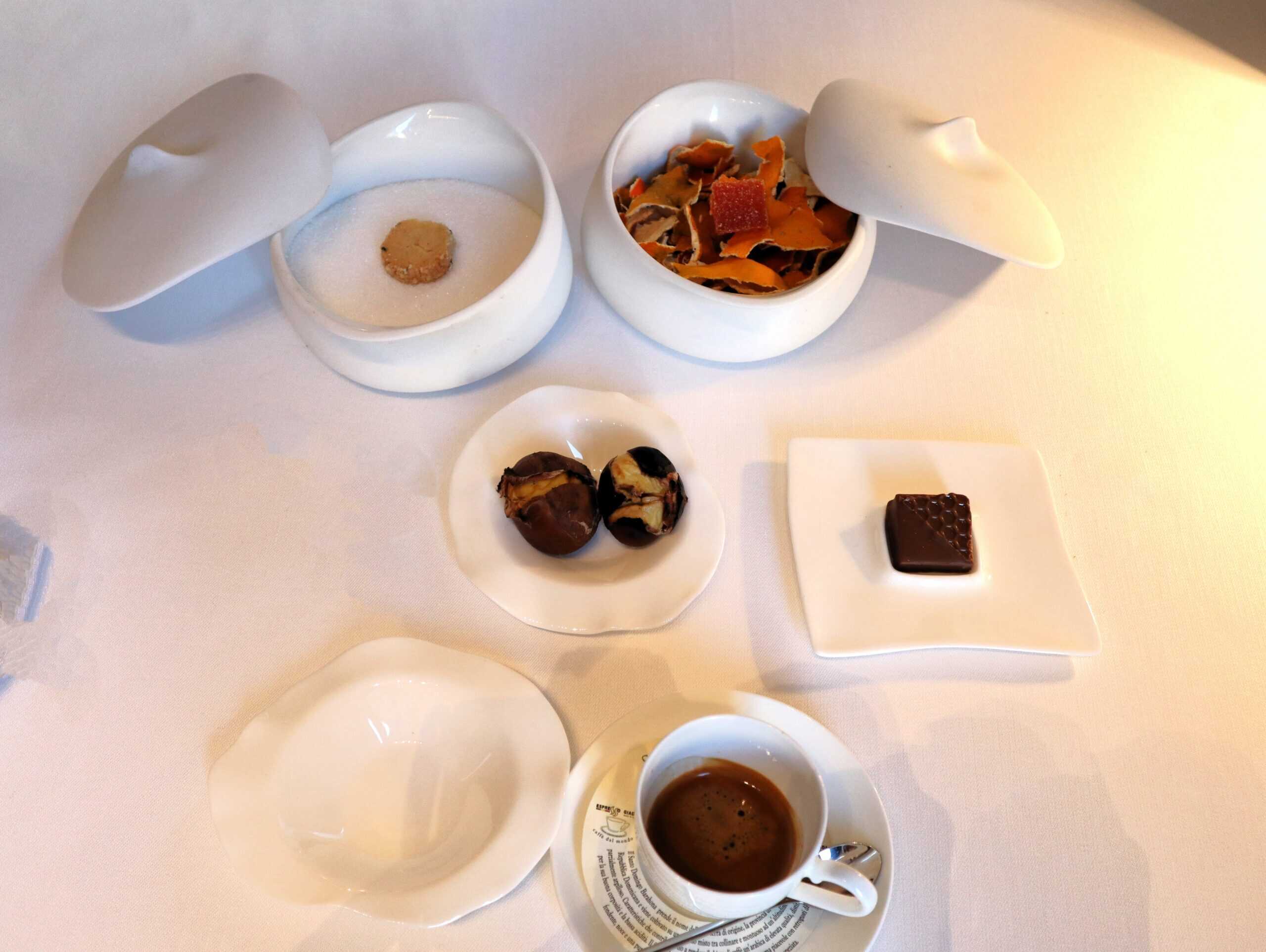 Piccola pasticceria: Cioccolatino miele d’acacia – Caldarroste – Gelèe frutto della passione – Biscottino con canapa, olio e limone del Garda.