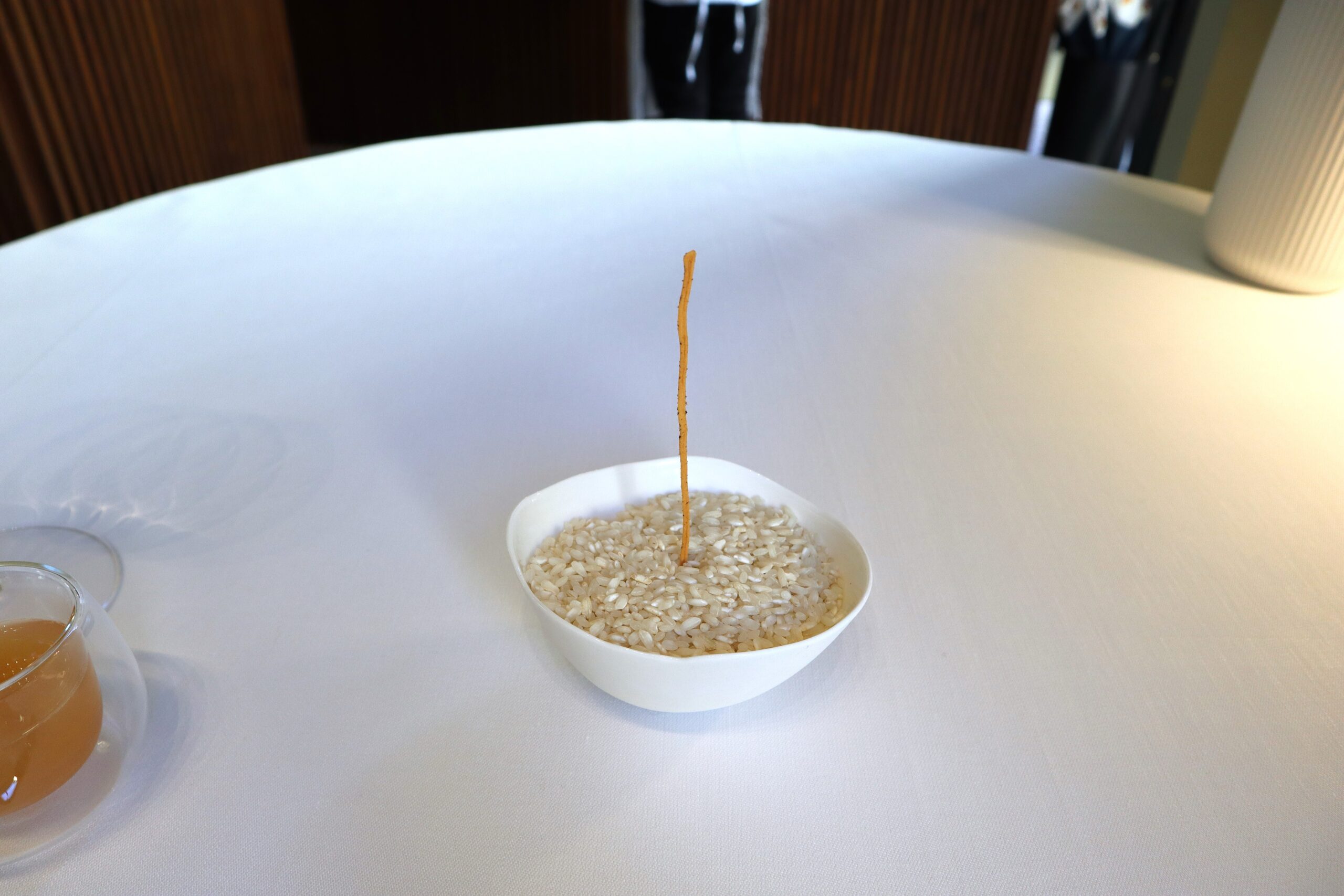 Entrée: Acqua di benvenuto a base di melone bianco, mela e anice stellato. Meglio lo champagne! – Grissino cacio e pepe. Ma che buono, peccato solo uno…