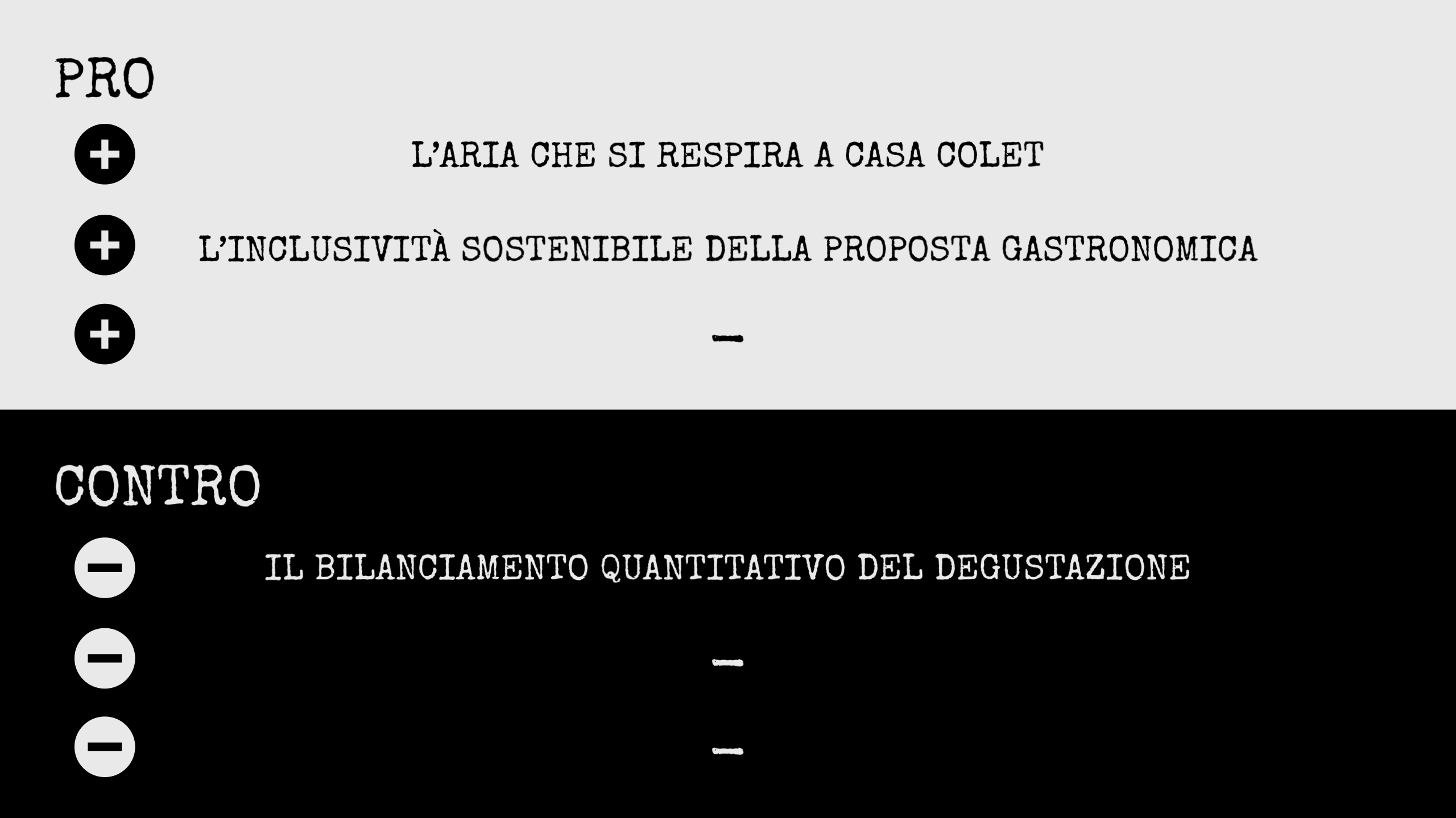 Trovata questa piccola quadra, sono certo che da bella novità Casa Colet possa trasformarsi in un luogo che potrà saziare felicemente negli anni a venire gli animi, e gli stomaci, di tutti gli avventori che vi cercheranno riparo da un mondo sempre più frenetico e opprimente. Che poi in realtà penso lo sia già.