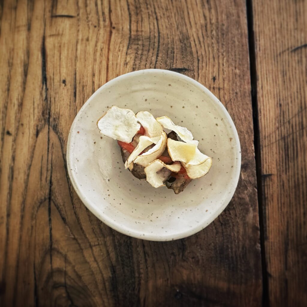 Queste sono le fotografie dei piatti assaggiati e che vanno a comporre il degustazione autunnale da 6 portate presentato giusto il giorno precedente, l’unico menù disponile a oggi per gli ospiti del ristorante, da scegliere al momento della prenotazione in alternativa a una più minuta proposta articolata in 7/8 passaggi da condividere a centrotavola.