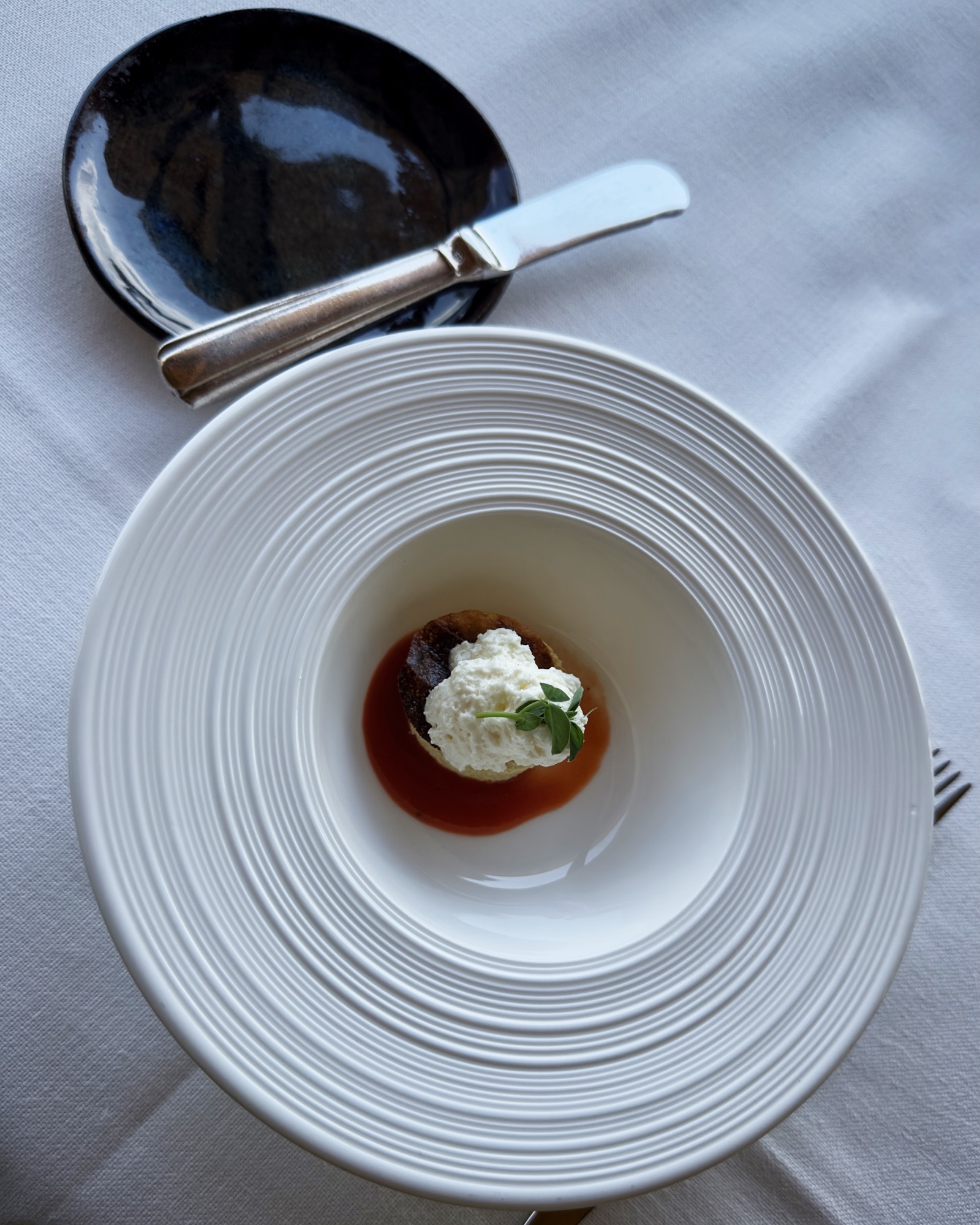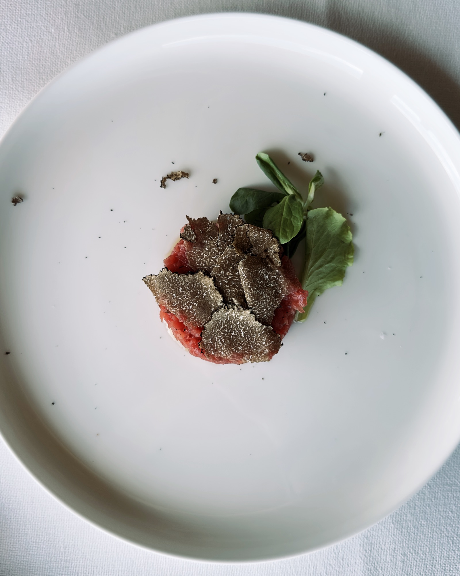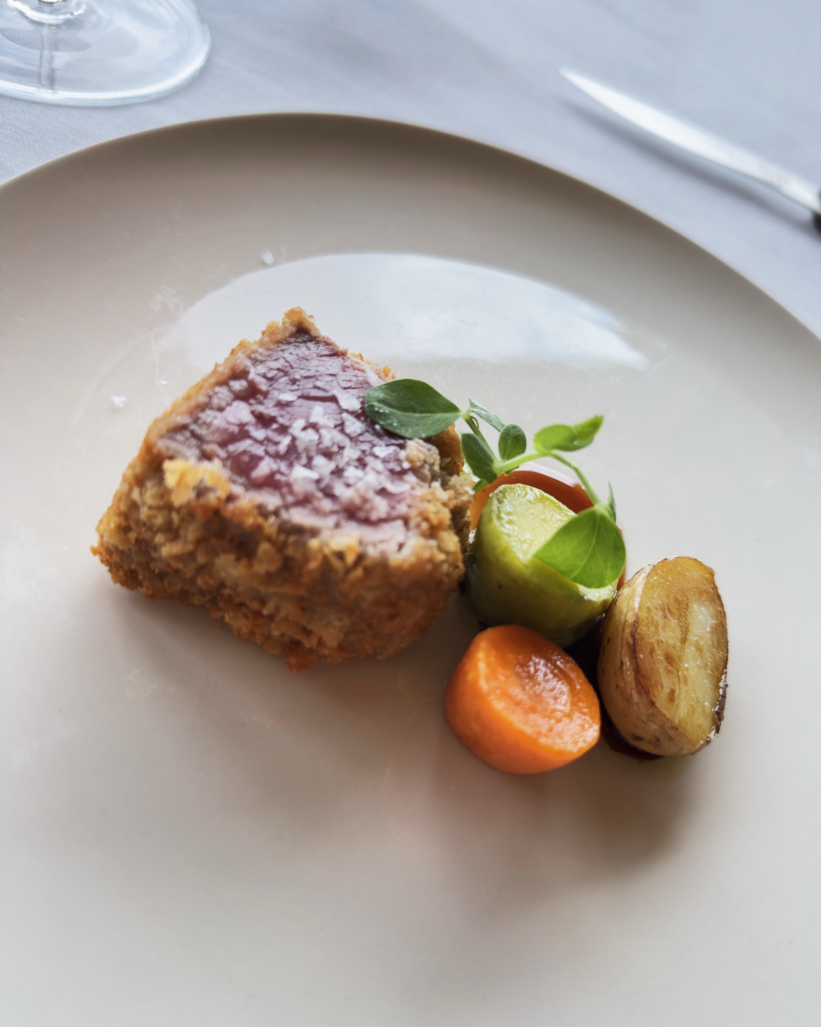La carta dei vini, piuttosto ampia e profonda, che, al contrario di come mi sarei aspettato, oltre all’ovvia panoramica sulla produzione di casa Conterno (Barolo, Gattinara…), presenta una selezione di etichette capaci di accontentare ogni palato. Dai metodo classico di Ca’ del Vent ai due Savagnin di Allante et Boulanger (100 euro/cad.), passando per tanta Langa, Barolo ma non solo. Ci si diverte a partire per esempio dai 25 euro chiesti per il Verdicchio “Le Oche” 2023 di Fattoria San Lorenzo, mentre i 1200 per il Monfortino 2015 evidenziano la correttezza dei ricarichi che crescono di pari passo con l’età del vino. Poter poi bere nei calici studiati da Roberto Conterno con Zwiesel è sicuramente un plus non da poco.