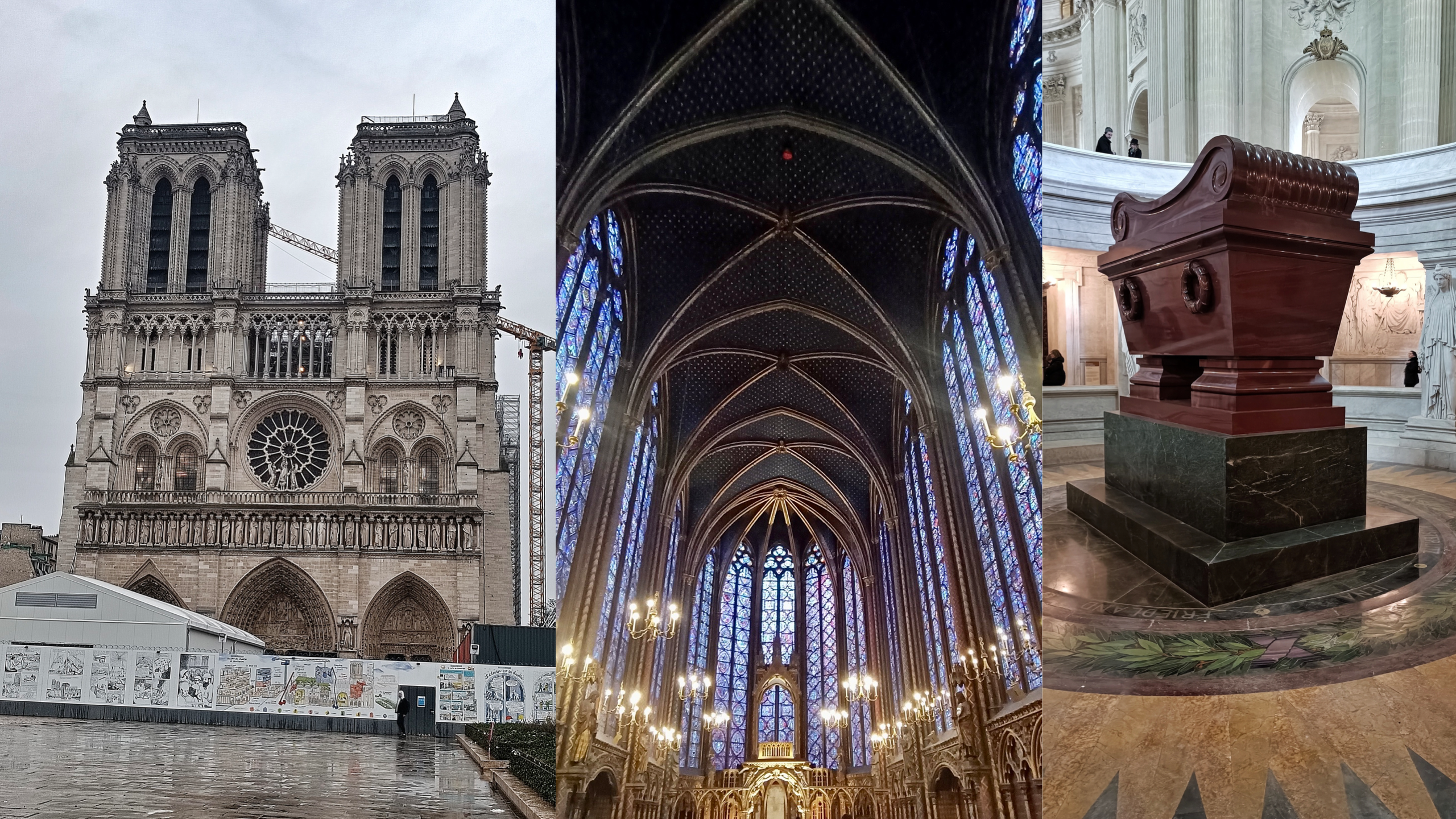La giornata non era di certo delle migliori: il cielo era di un grigio cupo, spesso piovigginava e la morsa del freddo non allentava la sua presa. Però non ci siamo fatti scoraggiare e dopo una colazione in un forno situato davanti al nostro albergo ci siamo recati alla fermata della metro. Arrivati nella zona di Notre Dame, visto che la pioggia ha provato fin da subito a rovinarci i piani, siamo entrati a visitare la suggestiva Sainte-Chapel. A seguire un rapido passaggio davanti alla famosissima cattedrale gotica parigina ancora chiusa dopo l’incendio che la colpì nell’aprile del 2019. A quel punto abbiamo sfidato la sorte e il meteo e ci siamo avventurati in una lunga camminata lungo la Senna fino ad arrivare all’Hotel des Invalides, in cui è presente anche la tomba di Napoleone.