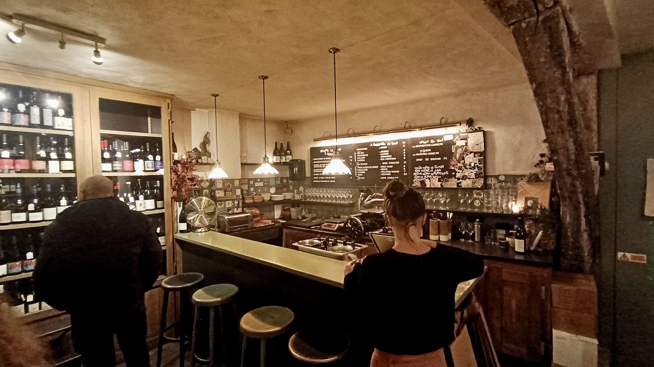 L’ambiente è piccolo, ma molto accogliente, tutto arredato in legno in stile rustico. Pochissimi i posti a sedere, tanto è vero che ci vuole veramente poco perché si riempia completamente. Non esiste una carta dei vini, le bottiglie sono esposte in 2 mobili situati ai lati del locale, mentre l’offerta al calice è scritta su di una lavagnetta (dai 6,00 ai 14,00 euro). Poche le proposte gastronomiche – non c’è una cucina -, ma va bene così, l’importante è poter sgranocchiare qualcosa mentre si sorseggia del buon vino. L’aria che si respira è frizzante e amichevole, giovanile. Insomma: è un posto perfetto per farsi una bevuta senza pensieri e in allegria.