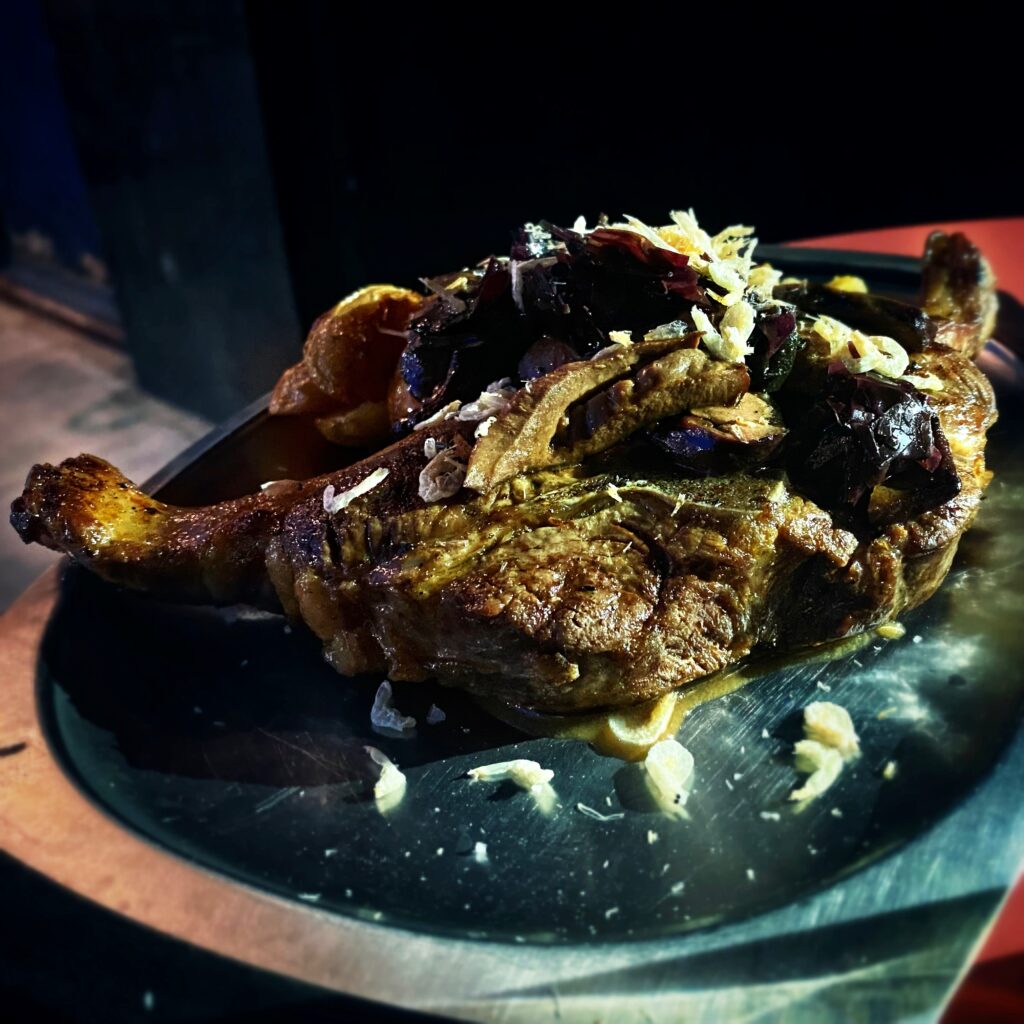 Flame grilled Barnsley chop, lamb heart, charred hispi cabbage & fermented shrimp butter, crispy lamb fat potatoes & pickled red pulse