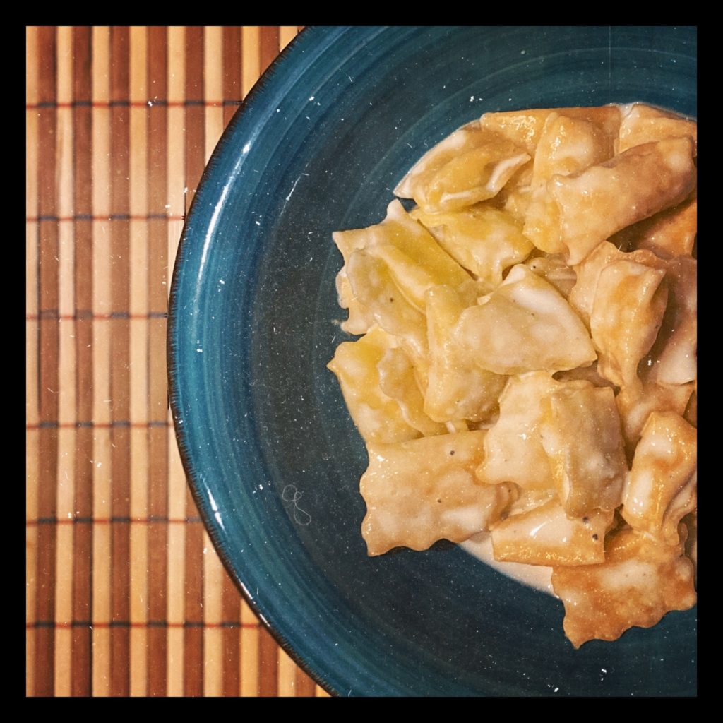 • Ravioli di patate e porri, salsa al parmigiano.
