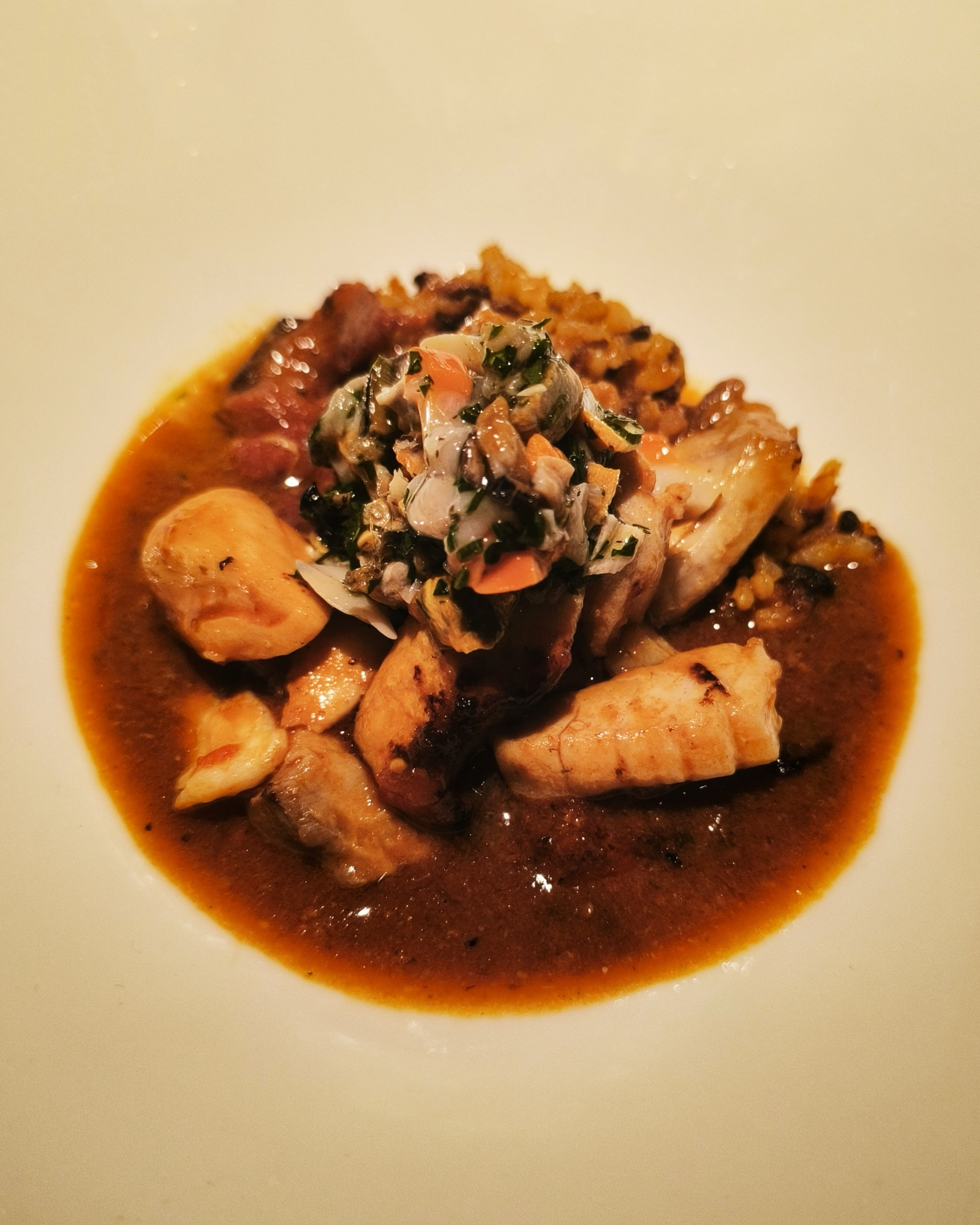 Le prime due portate dedicate al pesce crudo, ovviamente frollato, servono a far capire al commensale il perché di questa lavorazione e le differenze, di sapore e texture, con il prodotto fresco. Successivamente siamo passati ai piatti cotti, tra cui spiccava un utilizzo della griglia superlativo. Non che le altre tecniche di preparazione fossero da meno, eh.