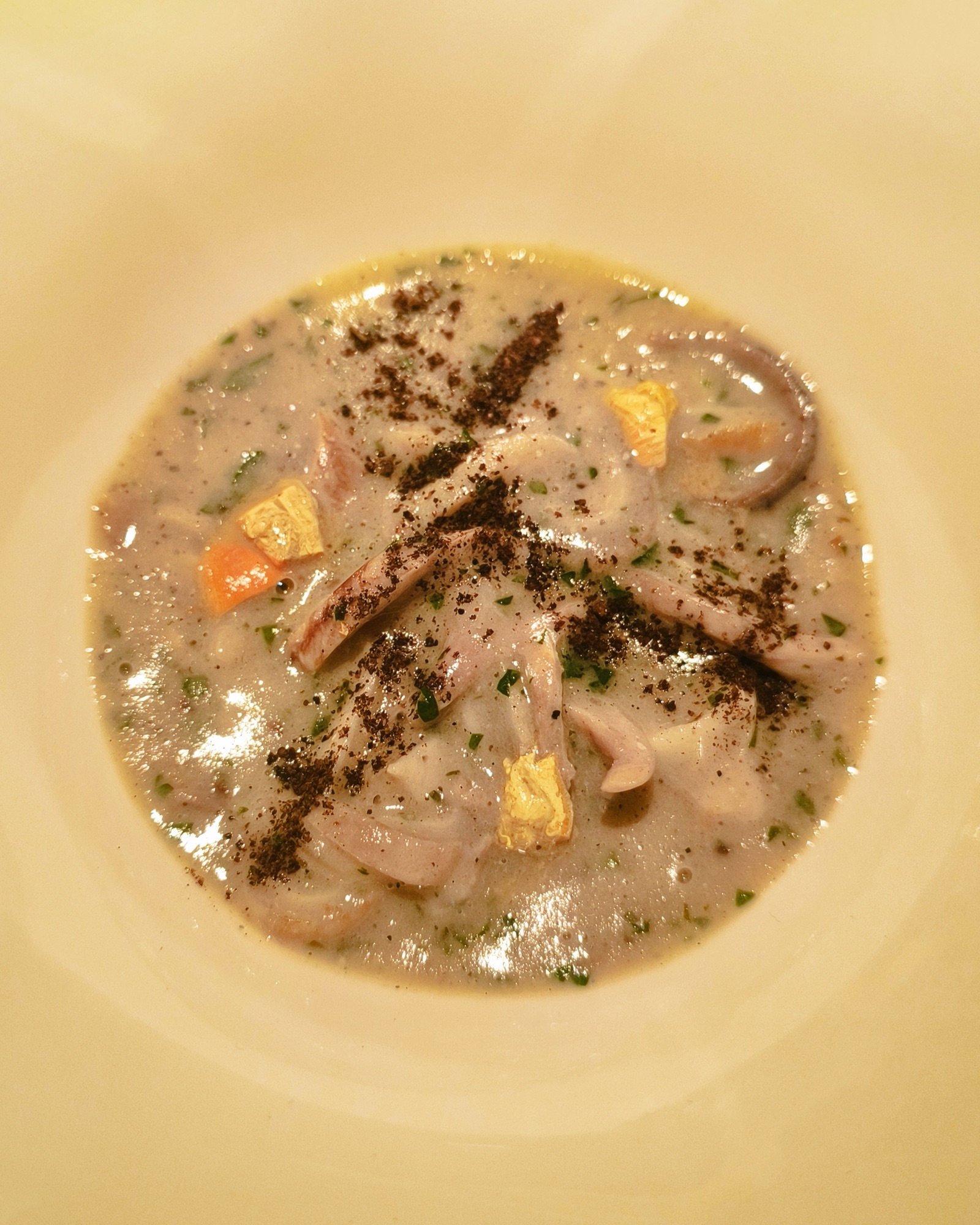 Trippe di pesce in crema di patate, tartufo bianco e limoni di mare