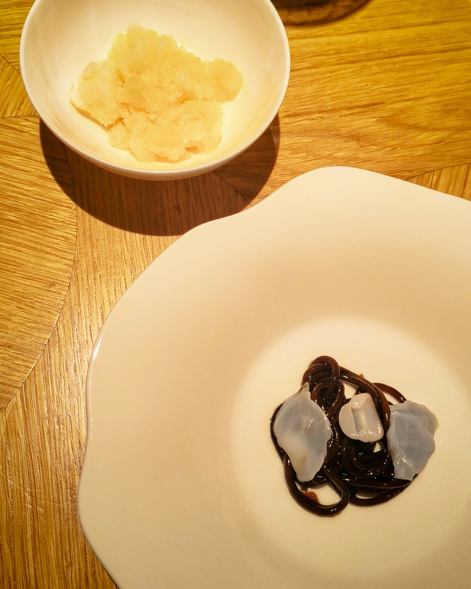 Spaghetti caramellati alla cipolla, polpo crudo e granita al pompelmo e acqua di mare