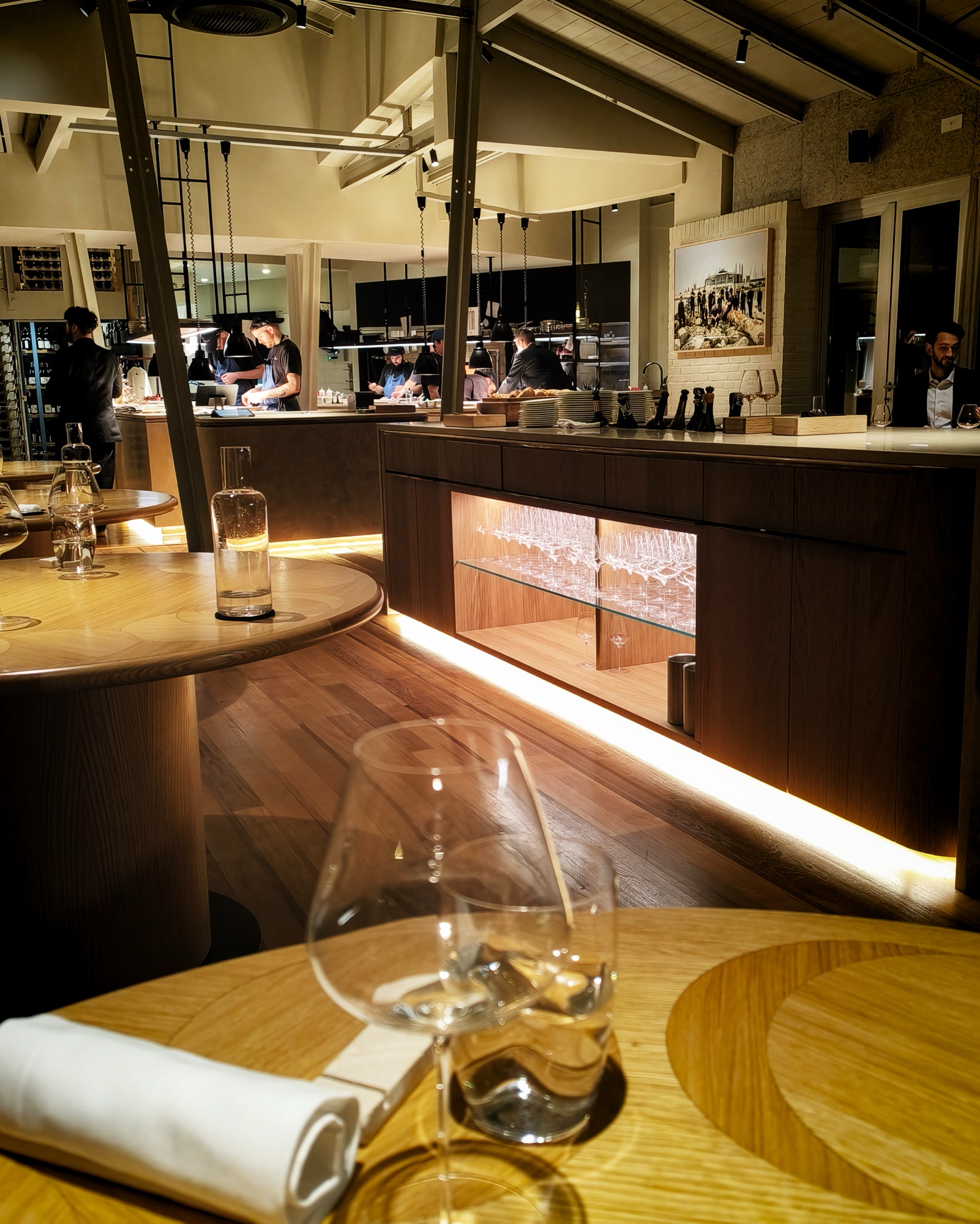 La nuova sala è ampia, moderna, giocata principalmente sul legno e circondata da vetrate che di giorno regalano appunto una grande luminosità. I tavoli sono disposti lungo il perimetro, mentre al centro si trovano diversi banchi di servizio. Al suo ingresso si trovano la cucina, completamente a vista, la cantina e i frighi per la frollatura della materia prima.