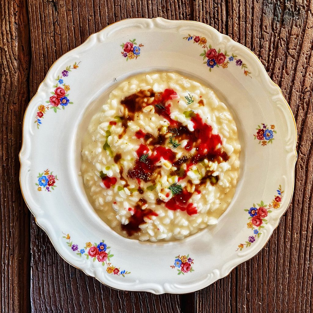 Risotto, finocchi affumicati#, jus di verdure#, lampone#