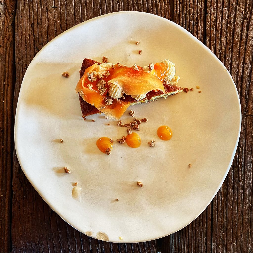 Torta di carote#, cioccolato bianco caramellato, genepy#