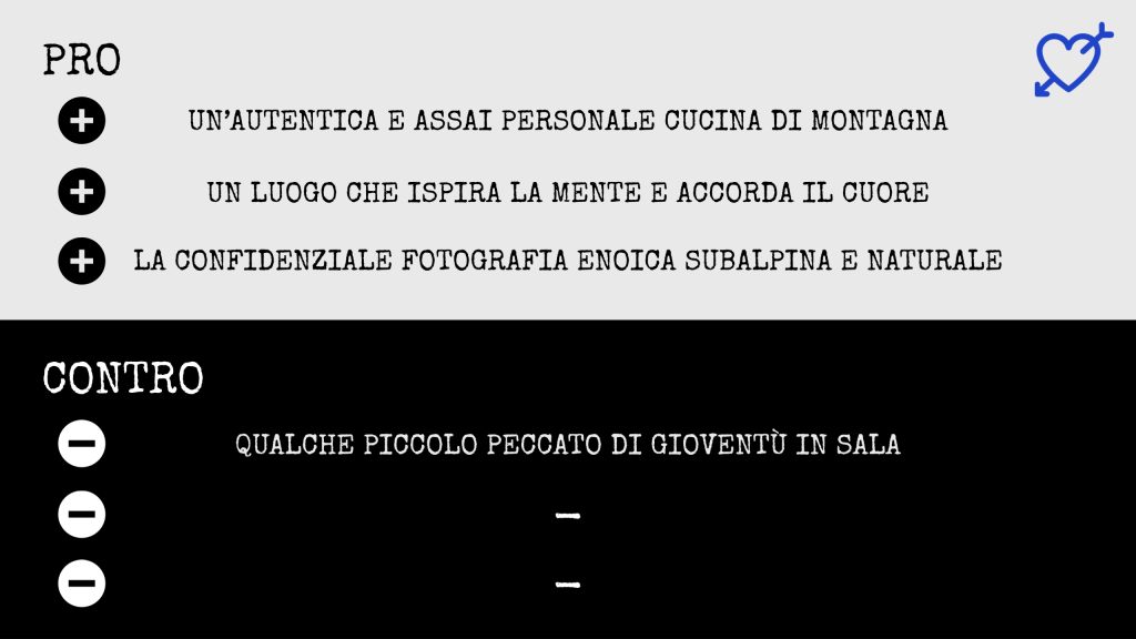 Il risultato è un qualcosa di magico, assolutamente viscerale e appagante, che grazie alla naturale commistione con la montagna mi ha toccato nel profondo. Pertanto preferisco non postare foto e video della location così da permetterti, nel caso optassi per una visita, di provare le mie stesse sensazioni. Riserva un tavolo nella sala superiore e dopo mi ringrazierai.
