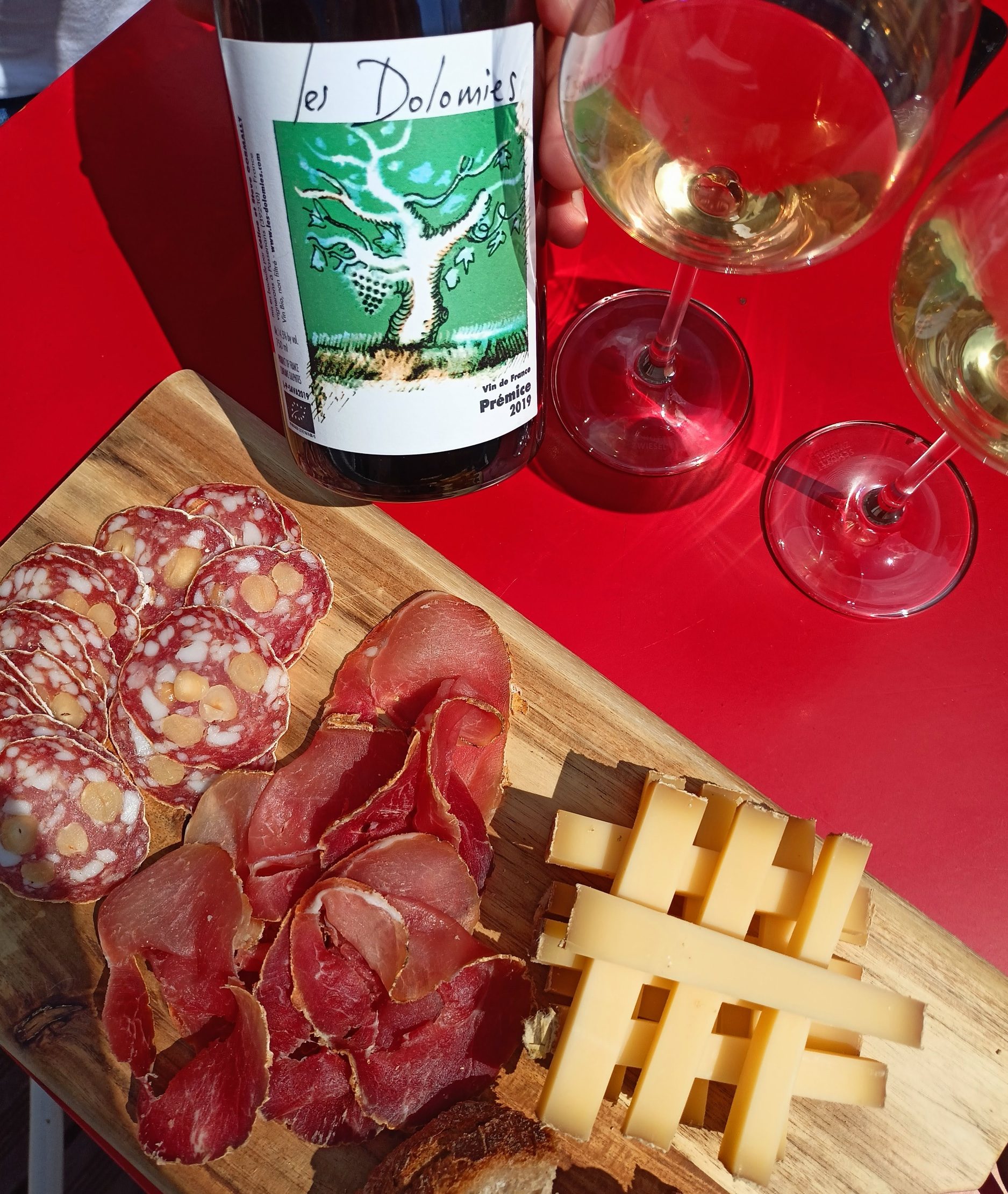 La nostra prima bottiglia di Les Dolomies (il Savagnin “Prémice” 2019) e un buonissimo tagliere di prodotti locali (Comté 12 mesi, salame con nocciole e una specie di prosciutto crudo affumicato), che è l’unico piatto che offre la casa, hanno fatto il resto.