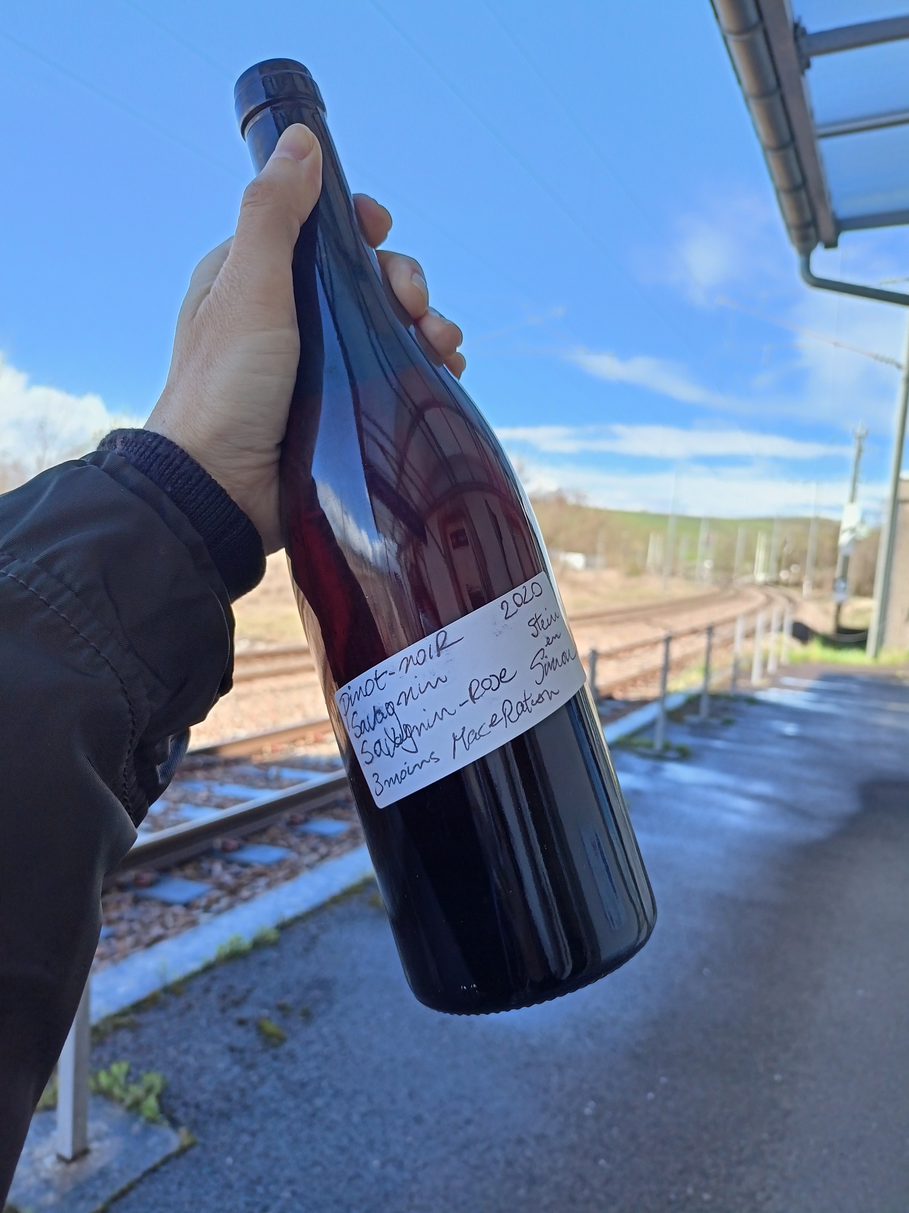 Beh, dopo aver finito di tostare un po’ di caffè, Simon ci ha salutato regalandoci una bottiglia di vino prodotto con un mix di uve bianche e rosse (Pinot Noir, Savagnin…) da lui insieme a un amico, Stein, proprio nelle vigne che si vedono sopra i binari della stazione… Ti piacerebbe assaggiarlo, vero? Sai dove cercare. Prego.