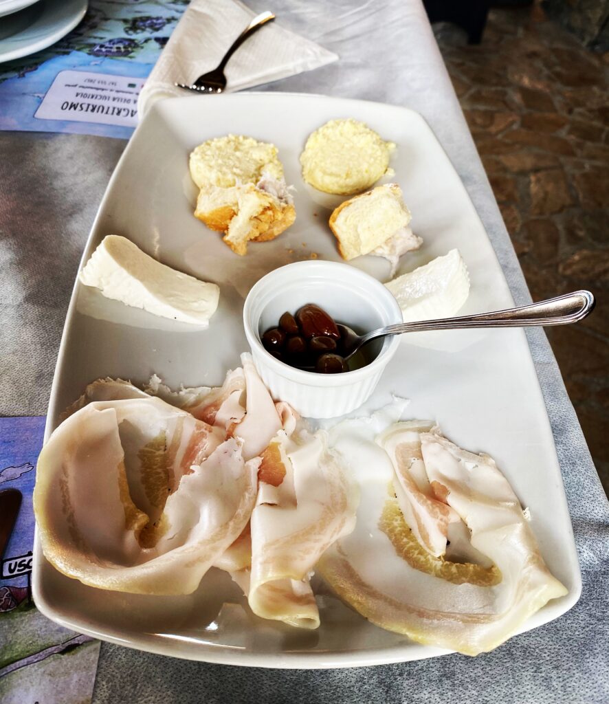 Dopo aver lasciato la macchina nel parcheggio dell’agriturismo, io e Pula siamo stati fatti accomodare, come da normativa vigente, a un tavolo in veranda dalla quale si ha una stupenda vista sul verde circostante e sulla Superba (Genova per i foresti), golfo compreso. Non c’era la possibilità di scegliere dalla carta, ma solo di pranzare con un menù degustazione (30,00 €) composto da un’antipasto misto, due primi, due secondi e, per una chiusura in bellezza, una fettIna di torta al cioccolato.