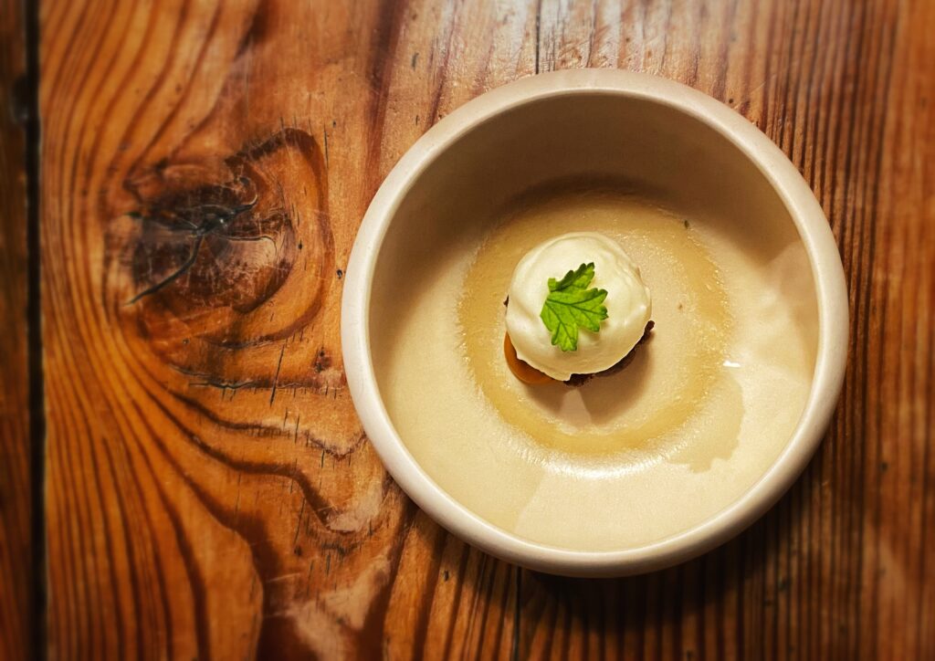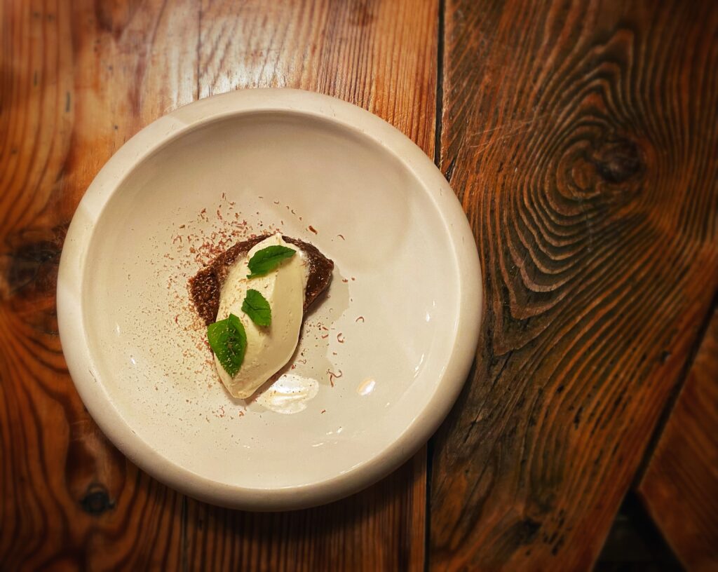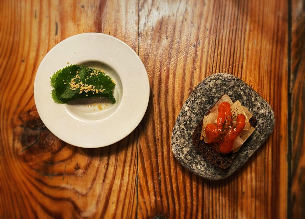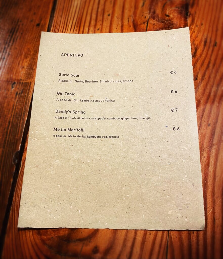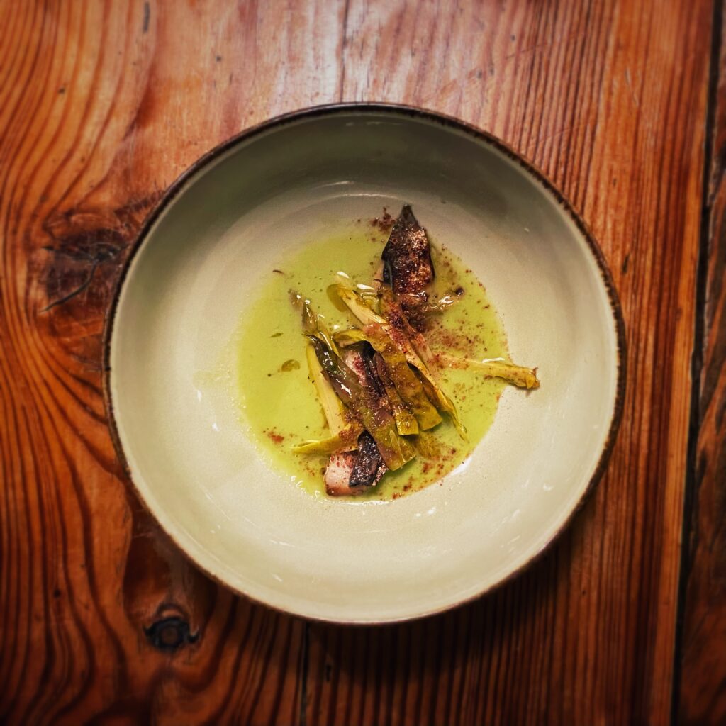 Il lavoro dietro a ogni sfumatura dell’offerta gastronomica appare davvero smisurato, non solo in cucina. Dalla scelta di eliminare la carta delle vivande alla non enciclopedica ma centrata selezione di vini (ci si diverte a partire dai 22,00 euro del rifermentato “Aire en el Patio la Tarancona” 2020 di Vinos Patio o dai 23,00 del “Roo” 2020 di Rocco di Carpeneto), dalla candela edibile servita con il pane alla proposta di caffè e digestivi, emerge in continuazione una direzione “ostinata e contraria” nel solco di un pensiero sempre coerente e ispirato. Entusiasmante.