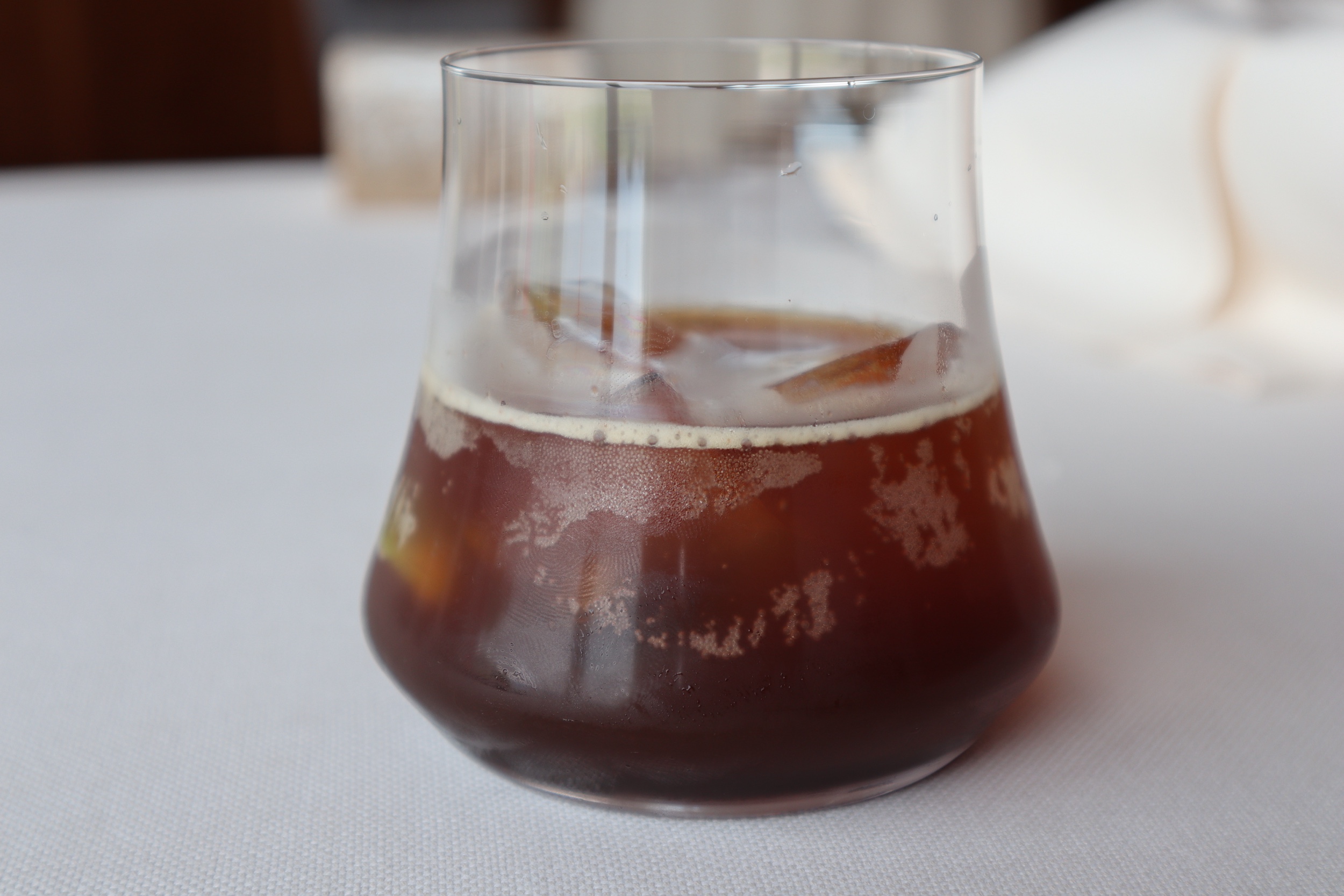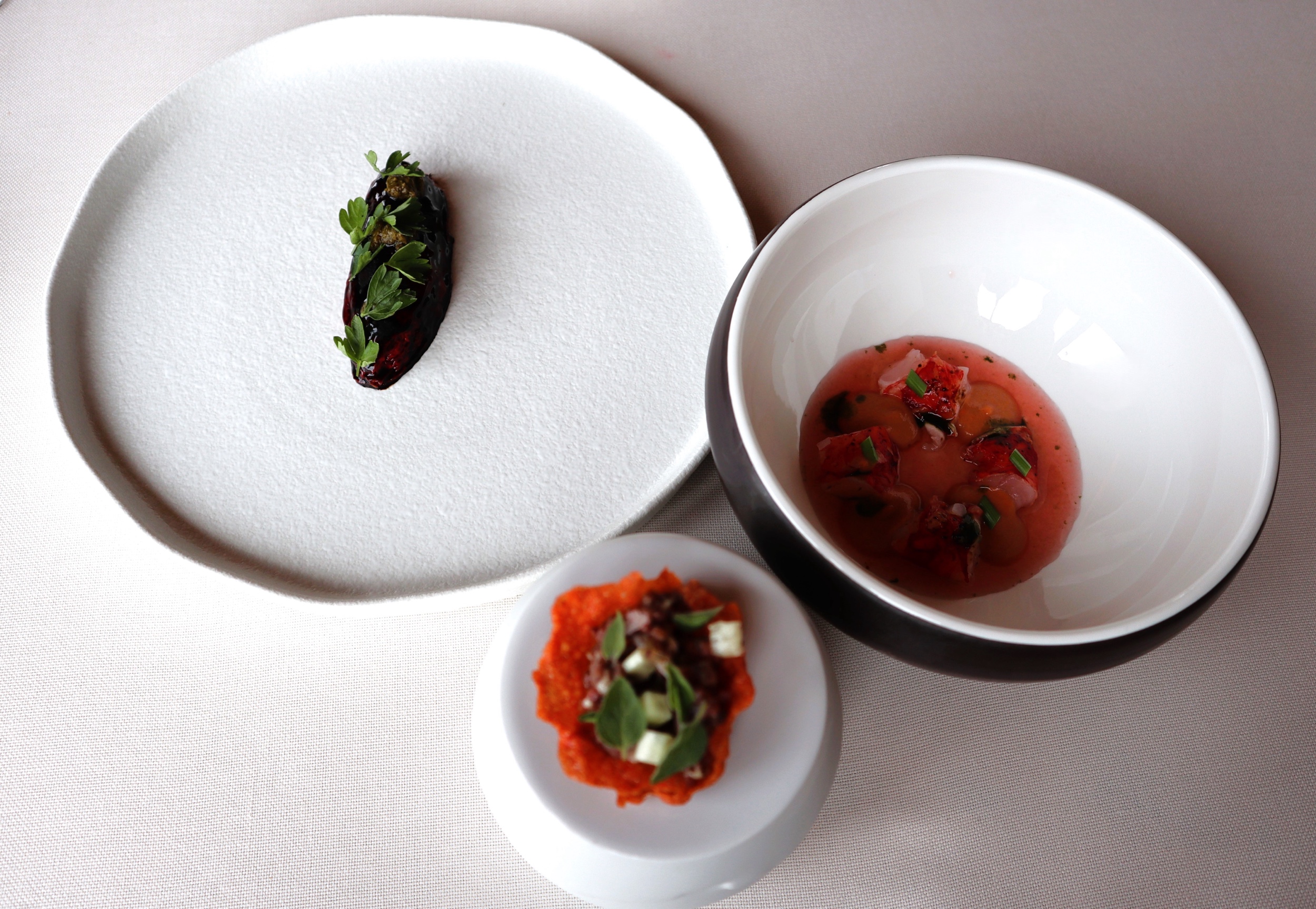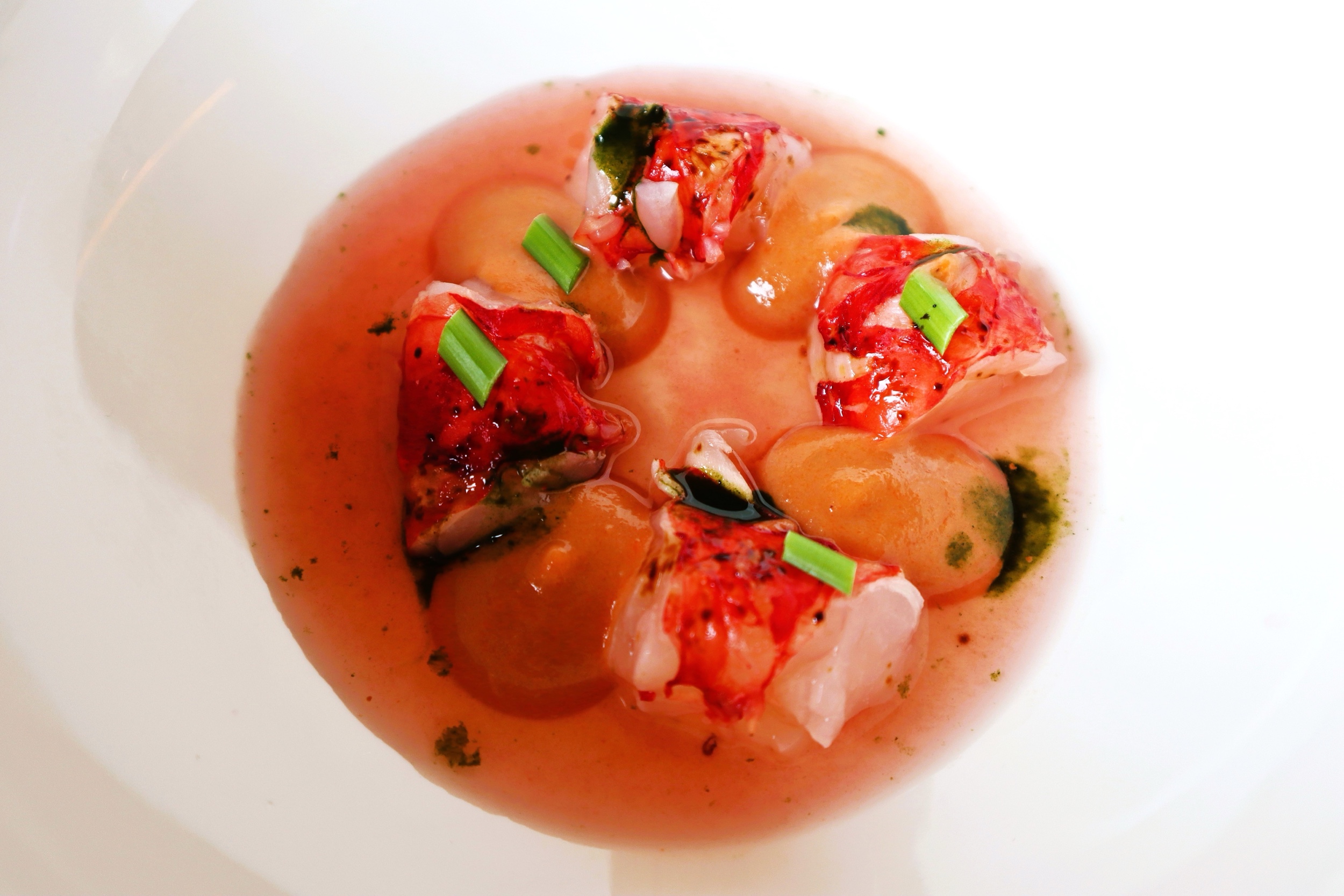 Consommé freddo alla camomilla, santoreggia e Hyōgo (brodo di ossi e cartilagini di vitello e infusione di camomilla selvatica)