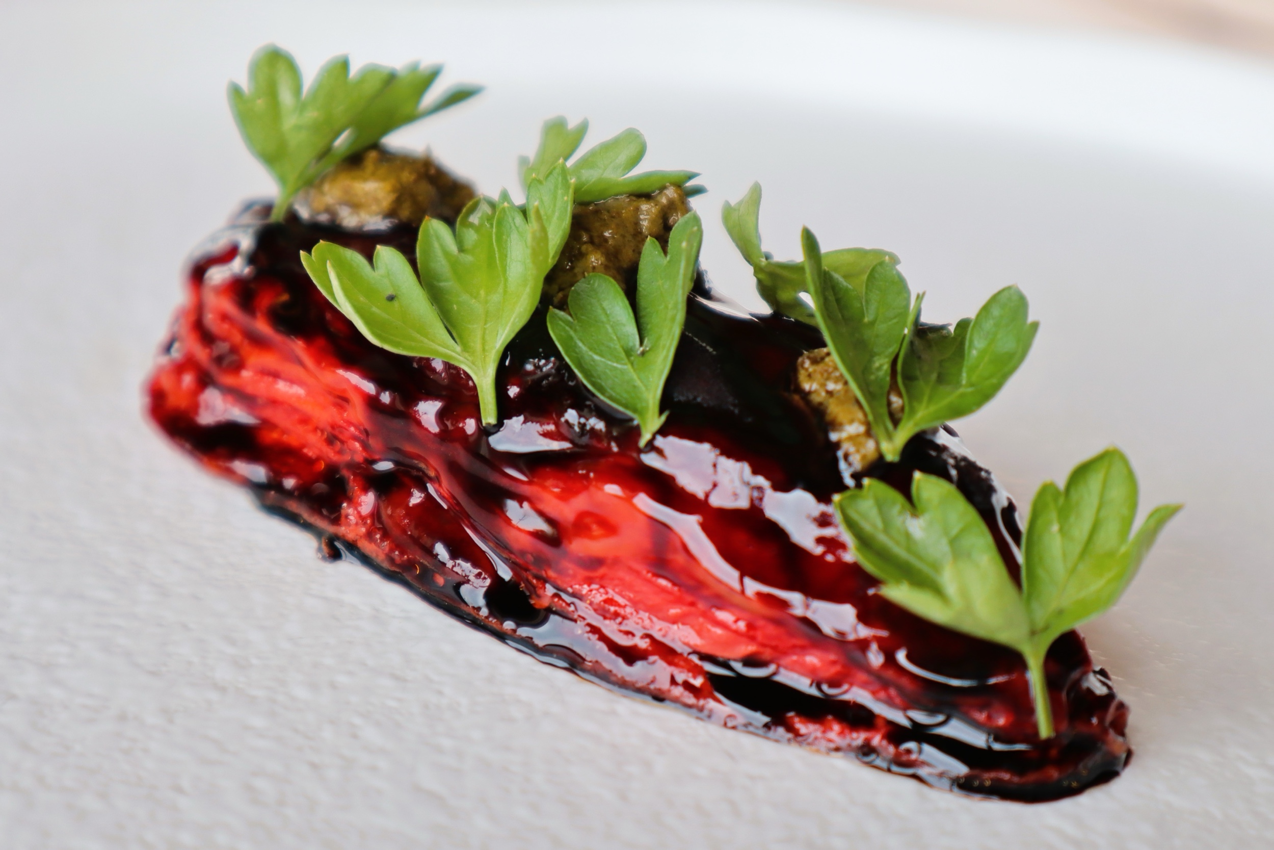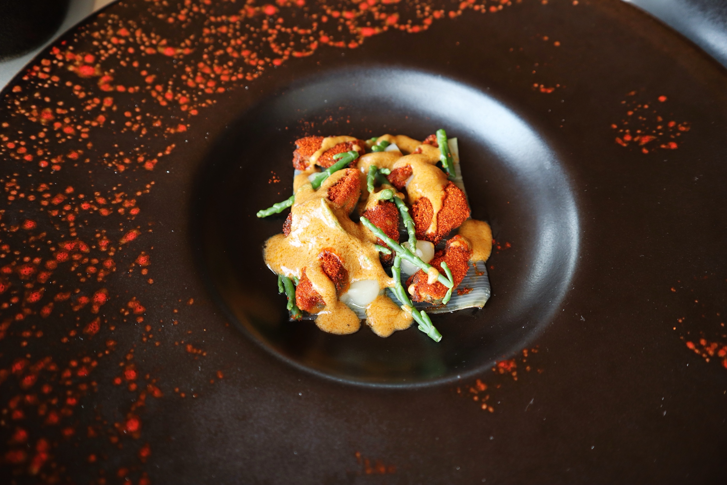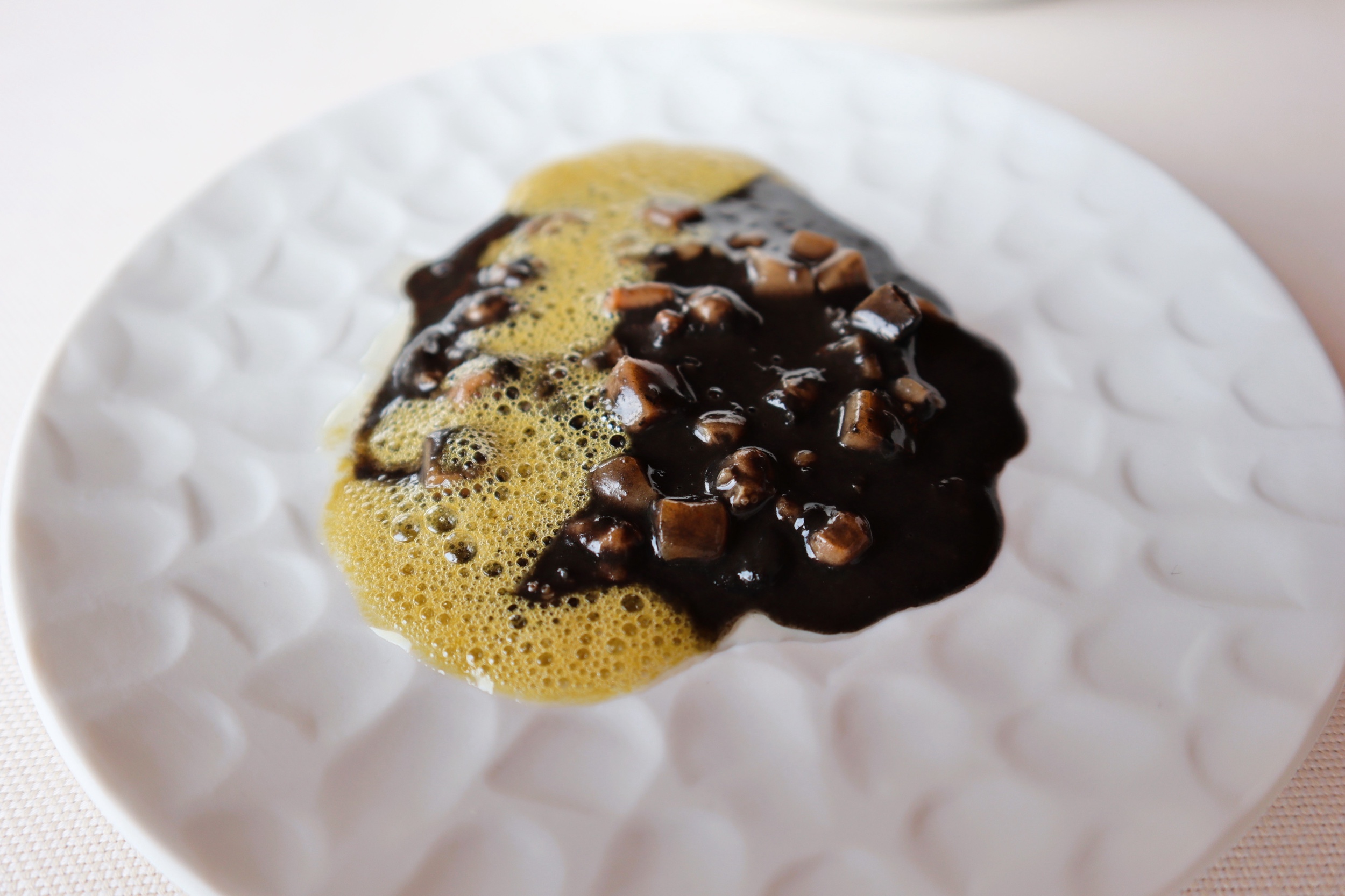 Alghe di mare alla brace, uvetta nella grappa, uovo adi aringa affumicate, salsa pontack