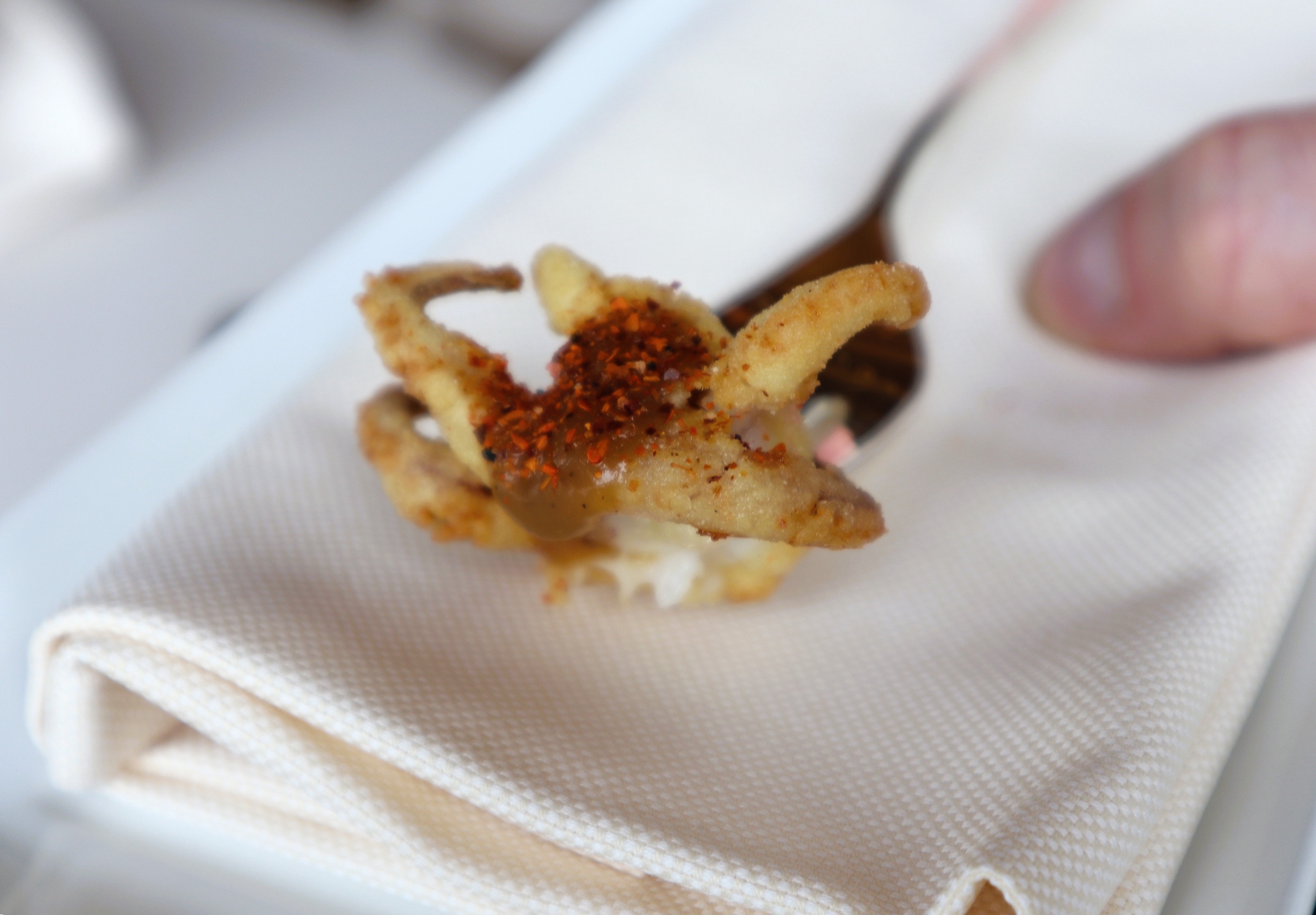 Casatella locale, anice, limone, caviale e ossalide. Servito con un “pane” fritto fatto di semi macinati