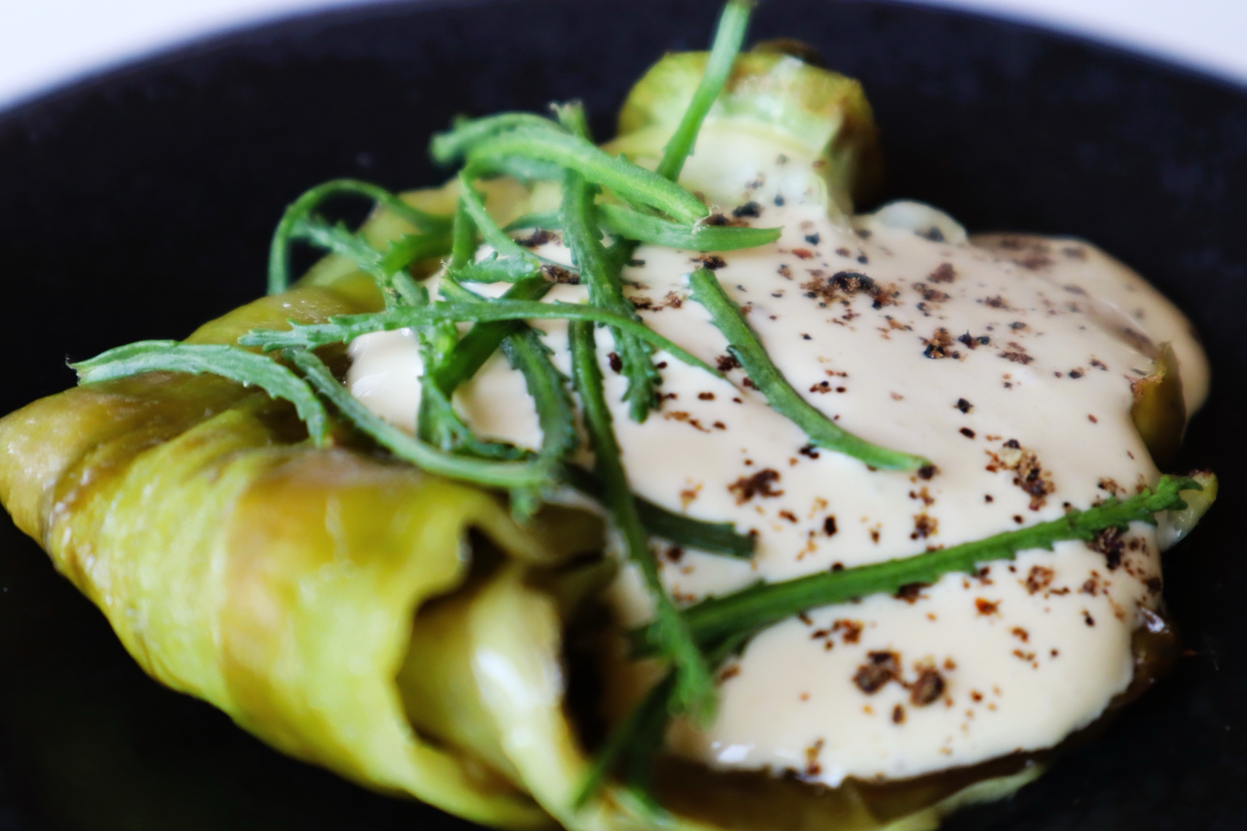 Lattuga alla brace, panna acida al rafano, aringa affumicata