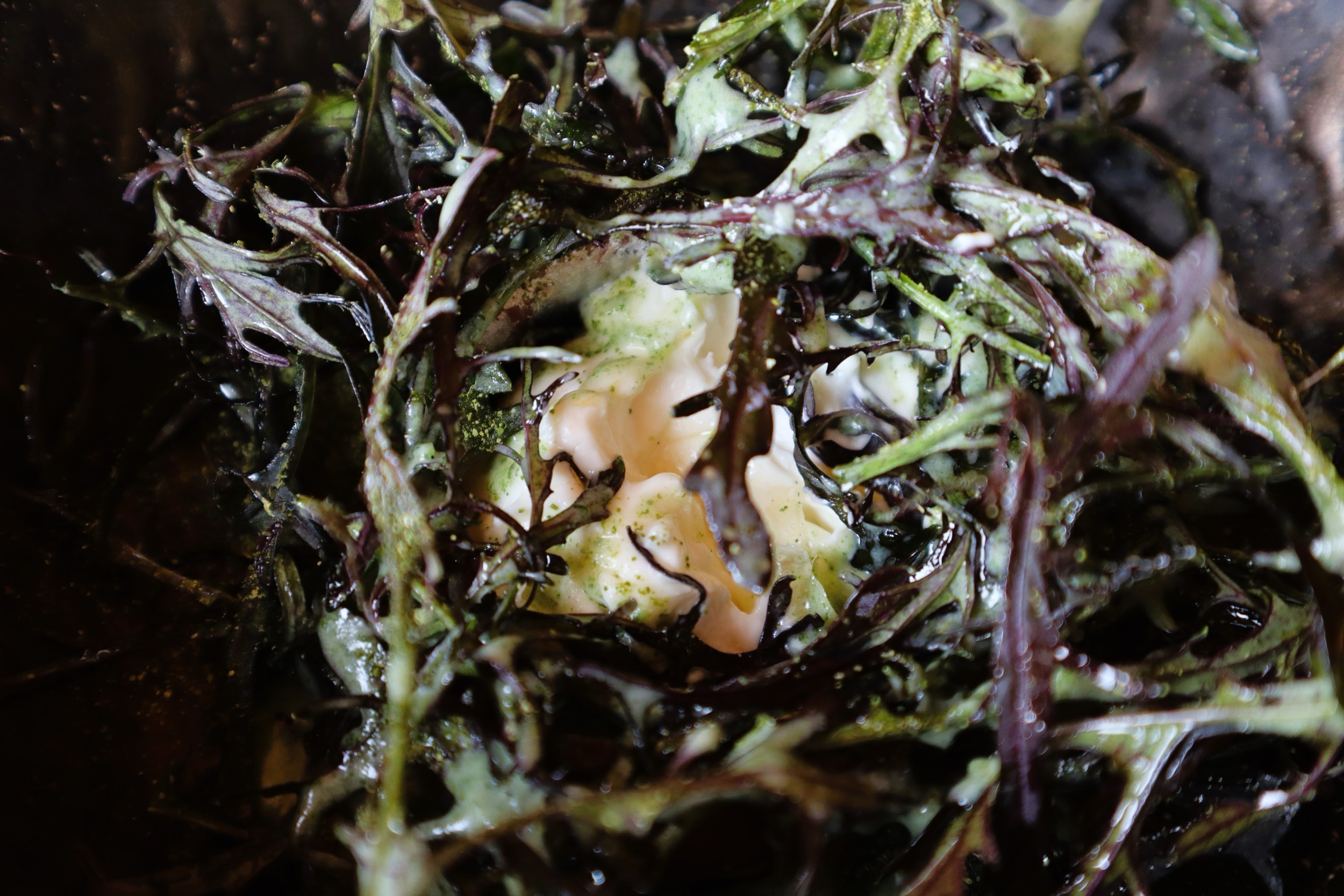 Mizuna, acciuga, miele e capra fermentata