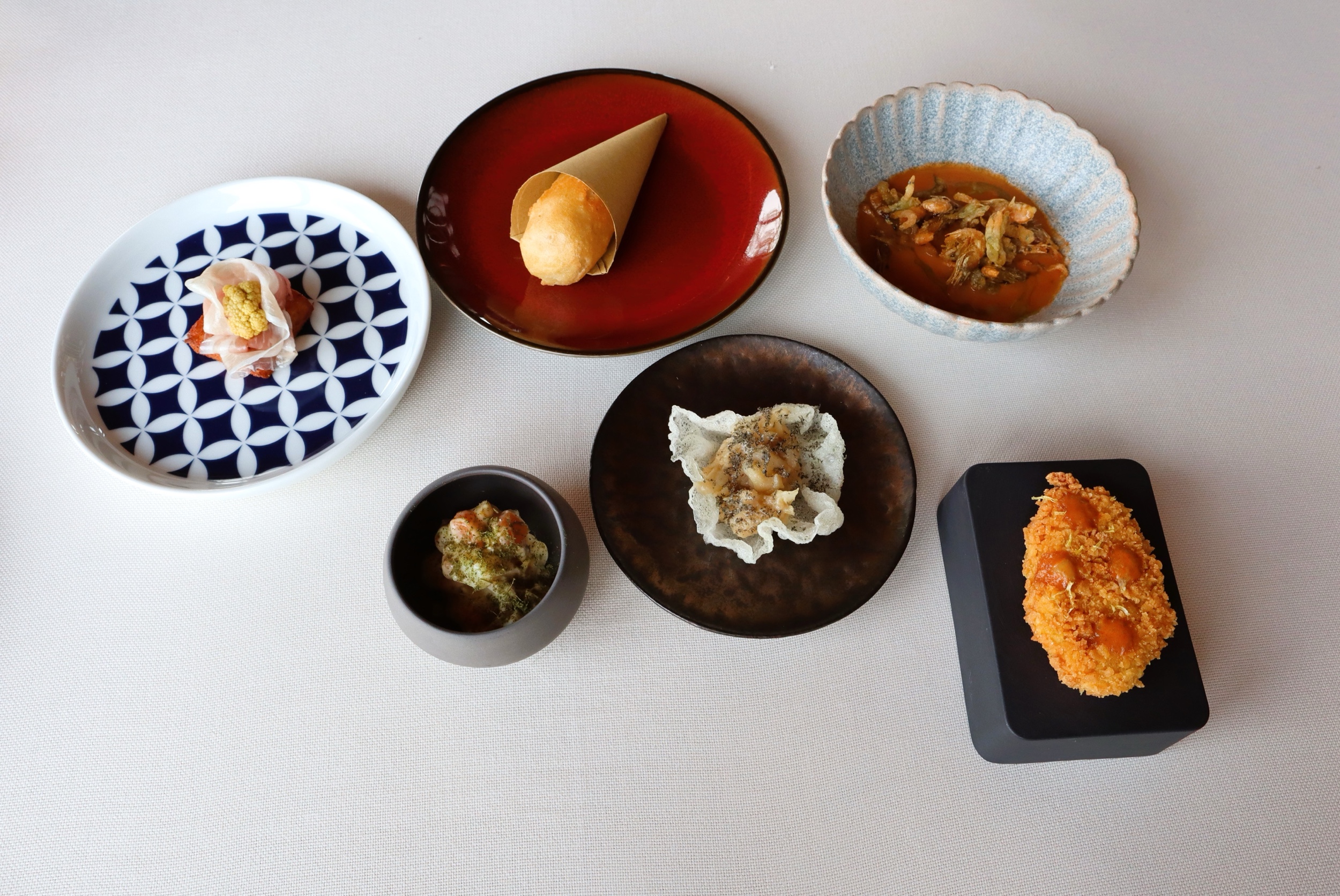 Aperitivo alle veneziana (in ordine sparso): Insalata di gallina e insalata russa – Cialda di baccalà e baccalà alla vicentina – Ostrica fritta – Zuppetta di schie – Mozzarella in carrozza alla vecchia maniera con prosciutto e salvia – Cialda di polenta con crociata (pancetta) e cavolfiore