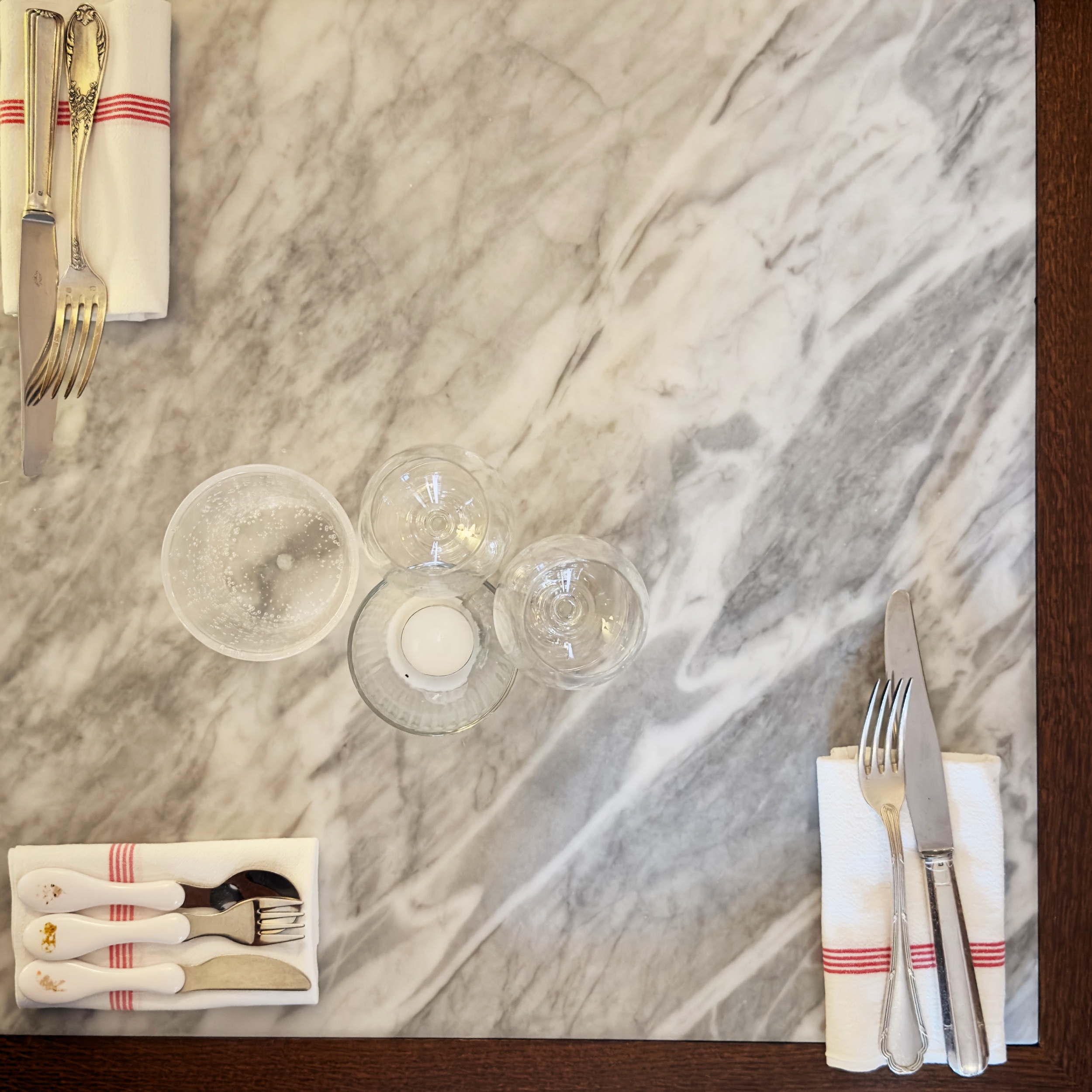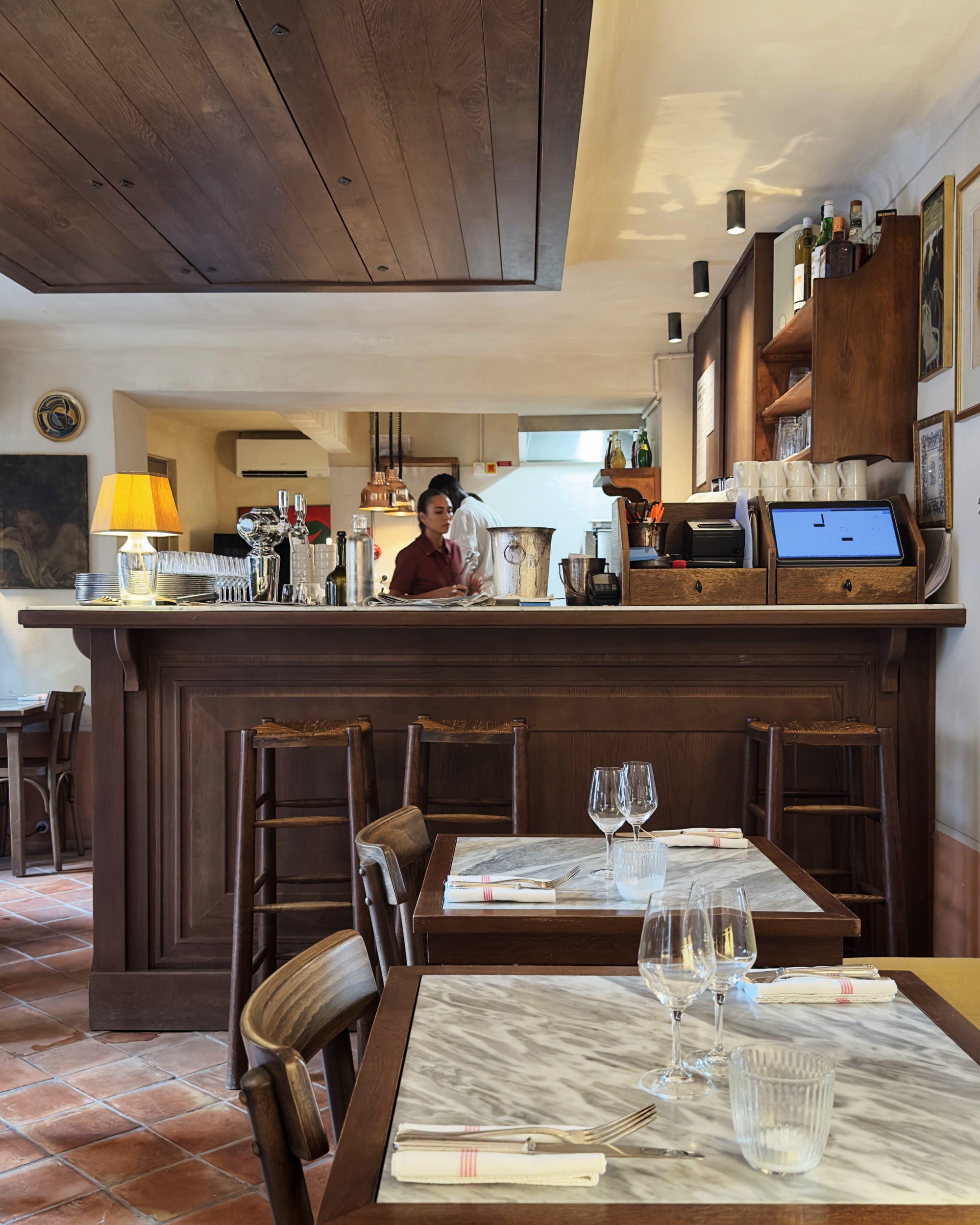 Dentro si respira un’eleganza d’antan, semplice, rassicurante: tanto legno scuro, dalle sedute al bancone, il pavimento in cotto, i tavolini ravvicinati dai piani in marmo chiaro, la lavagna dei piatti del giorno e un grande specchio che oltre a catturare la luce proveniente dall’esterno funge da carta dei vini. Insomma, l’atmosfera risulta conviviale, per nulla fredda, e, anche grazie a una mise en place minimale ma curata, restituisce l’idea di un luogo a misura d’uomo.