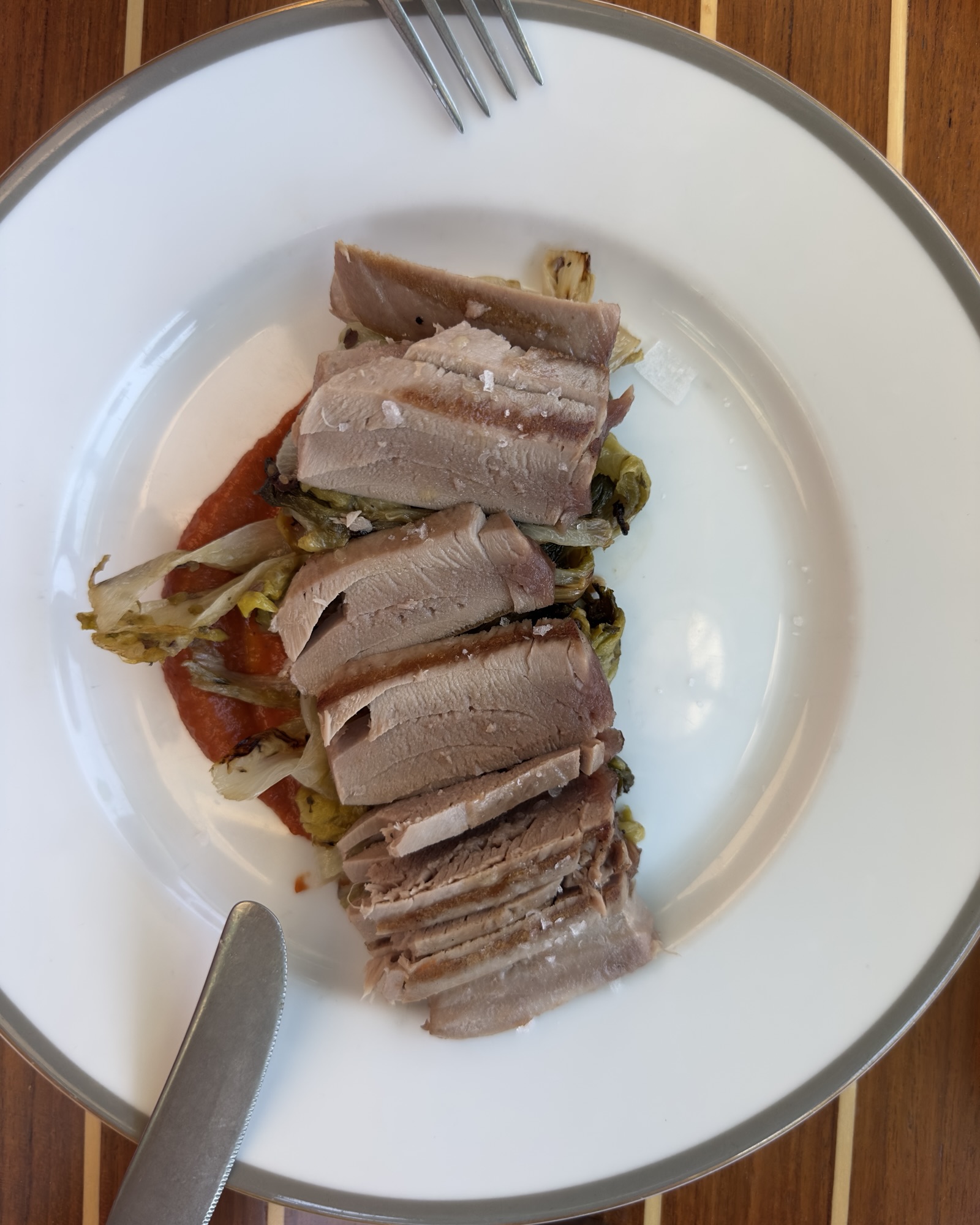 Dunque perché non lo dico? Perché, proprio tenendo conto di tutto ciò, l’uscita dalla cucina di un tonno rosso (stra)cotto sul carbone così (sinceramente con una cottura del genere non saprei neanche valutarne la qualità…) l’ho trovata piuttosto inaccettabile. Dico “piuttosto” siccome, per non rovinare il pranzo a chi mi accompagnava mandandolo indietro e…, me lo sono mangiato in silenzio sorridendo. Amaramente eh.