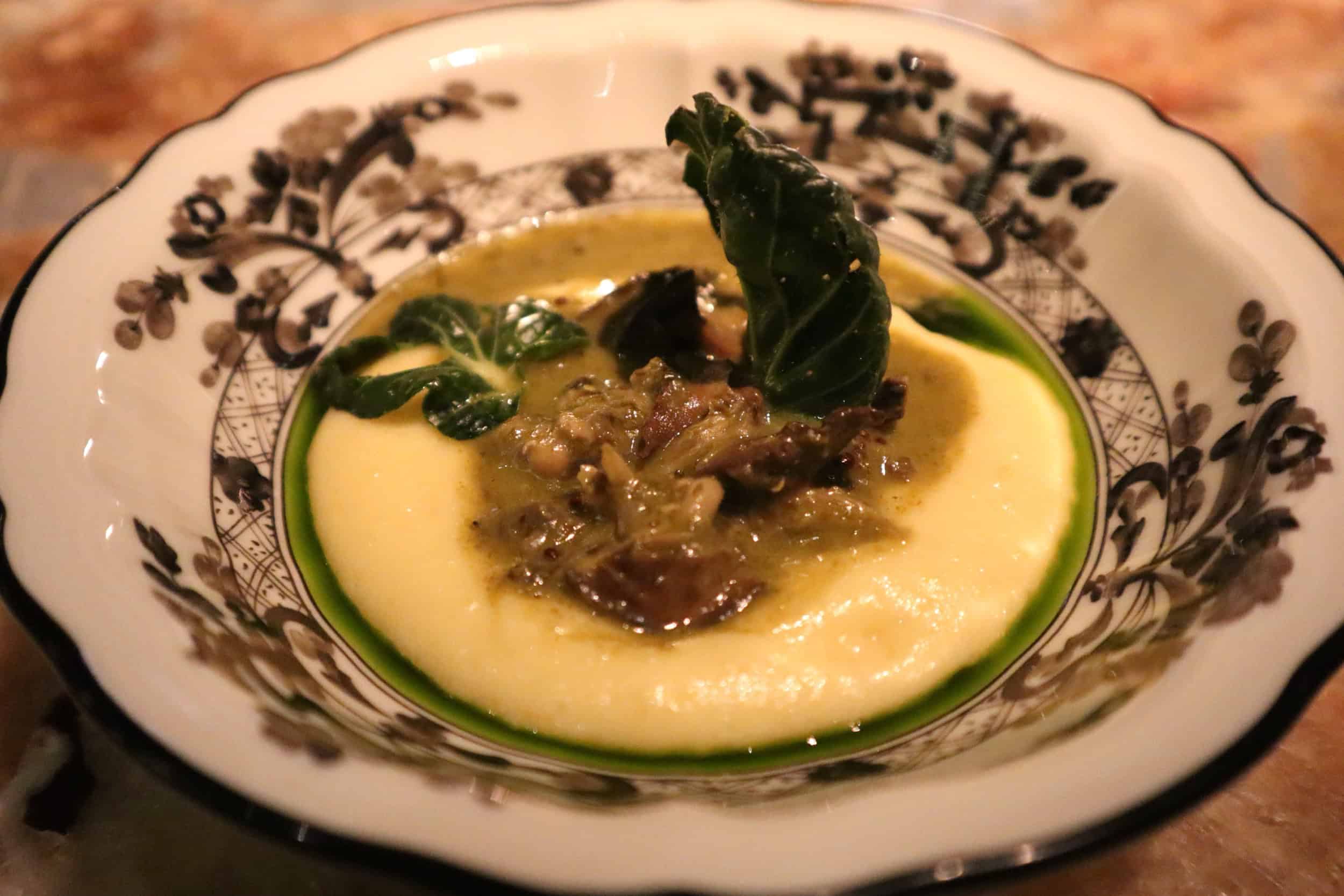 Raviolo di patate, cervo e porcini alla brace, servito con un fondo di porcini e, al posto del parmigiano, castagne grattugiate. Delizioso nella sua grande golosità