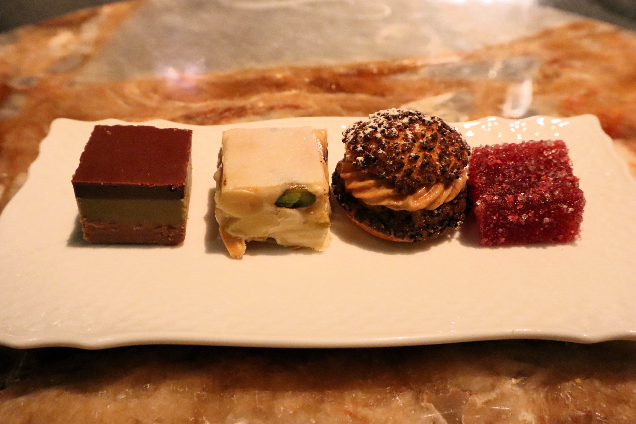 Piccola pasticceria: Gelatina ai lamponi – Bignè al caffè, koji e caramello salato – Torrone al cioccolato bianco e bergamotto candito –  Cremino ai 3 cioccolati