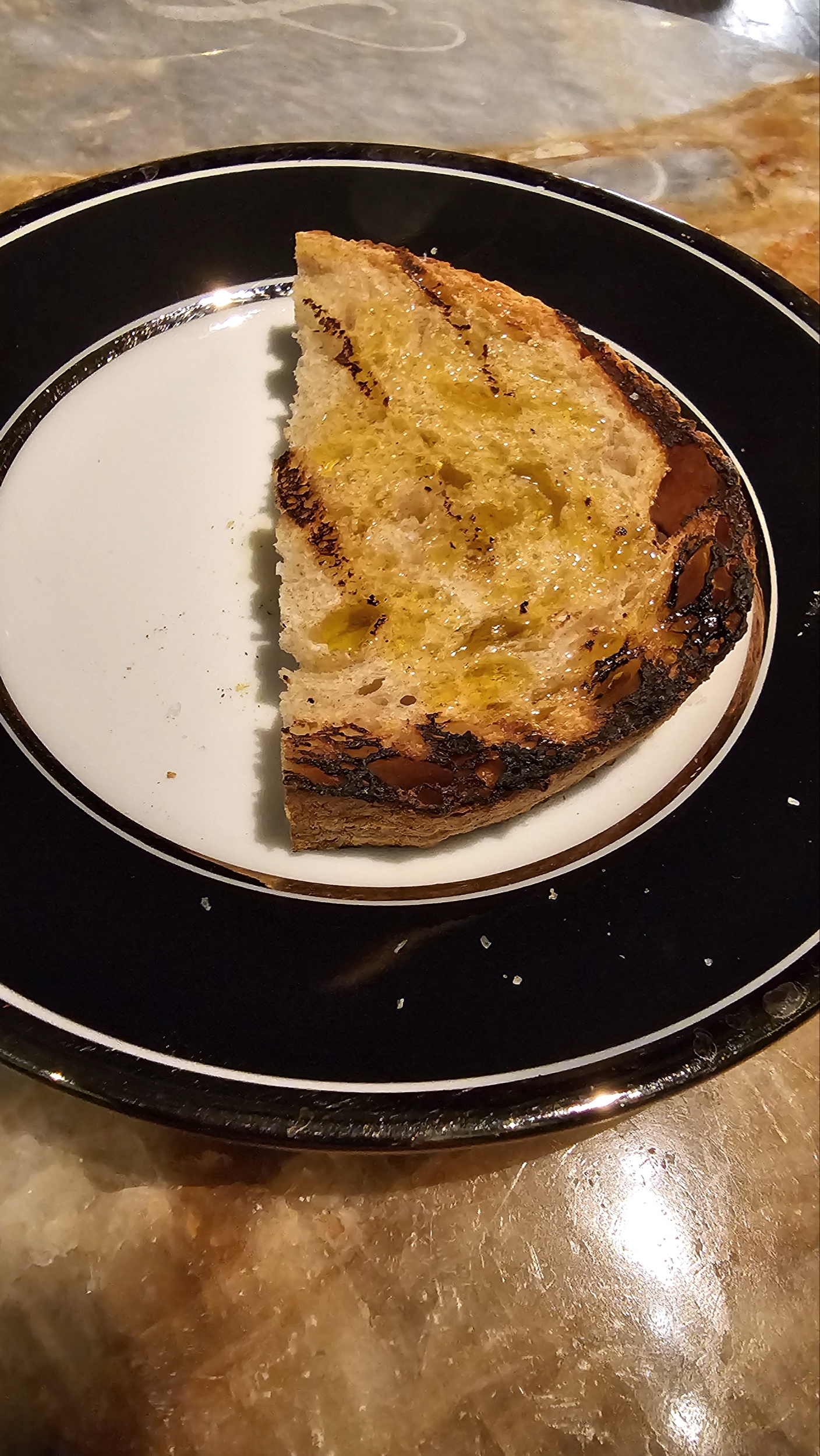 Fettunta. Pane tostato con sale di Cervia e olio evo (Moraiolo e Leccino dall’orto del ristorante nei dintorni di Firenze)