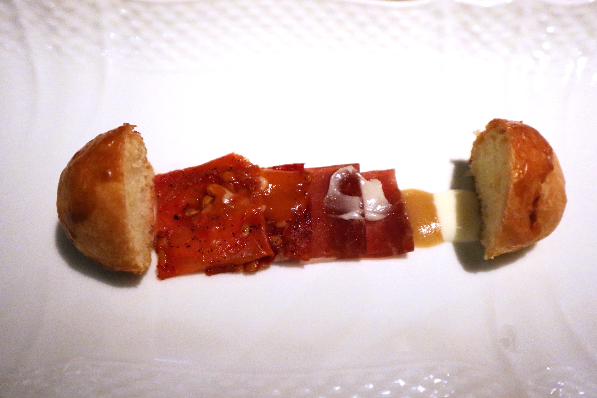 Panino al prosciutto. Una versione giocosa composta da pan brioches, crema al latte, crema al pane, fettina di pomodoro confit, prosciutto di razza Mangalica. Unire con le mani e mangiare in un boccone! Gnam…