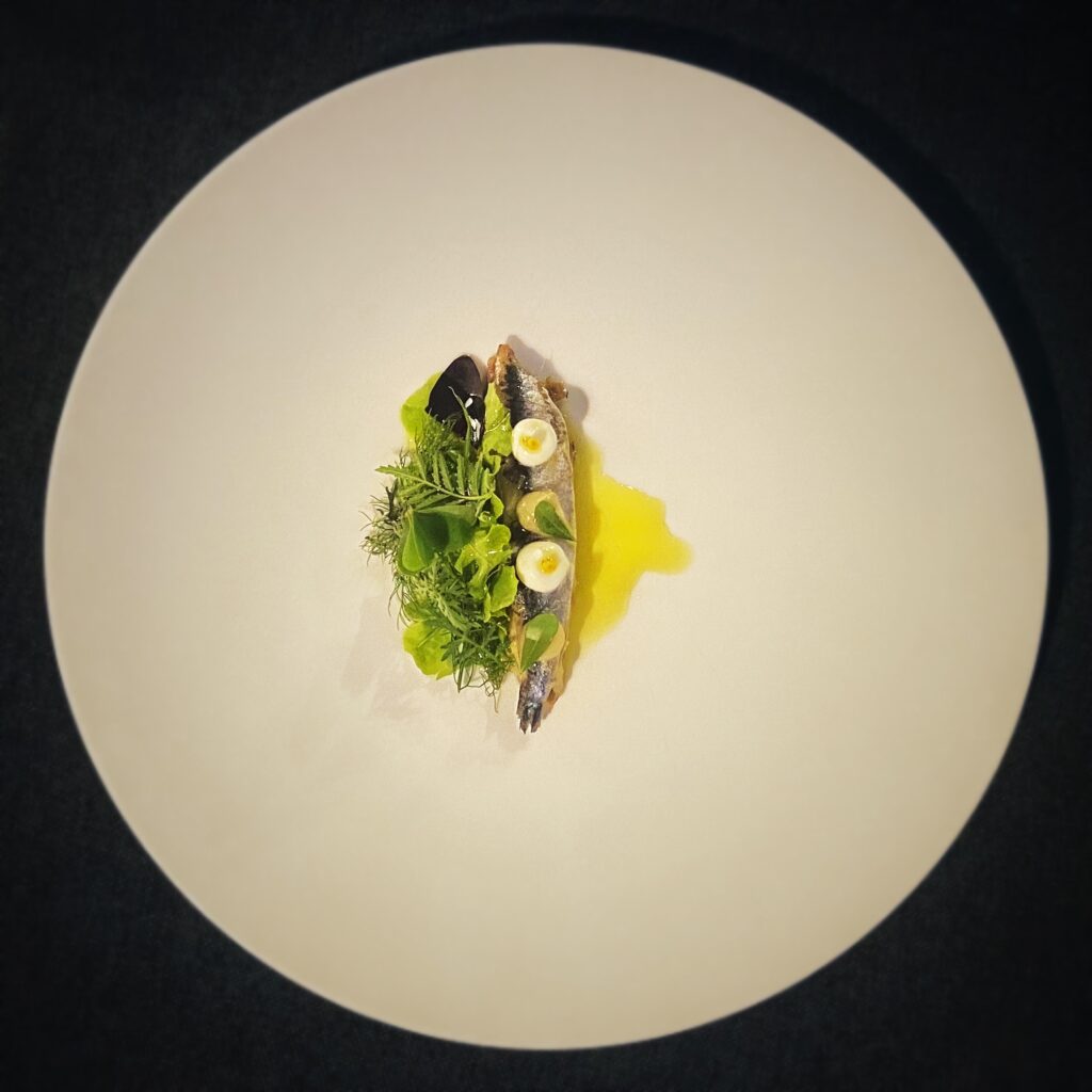 Acciuga, crema di carciofi, patate e olive, gel di limone, insalata dell’orto ed erbe selvatiche