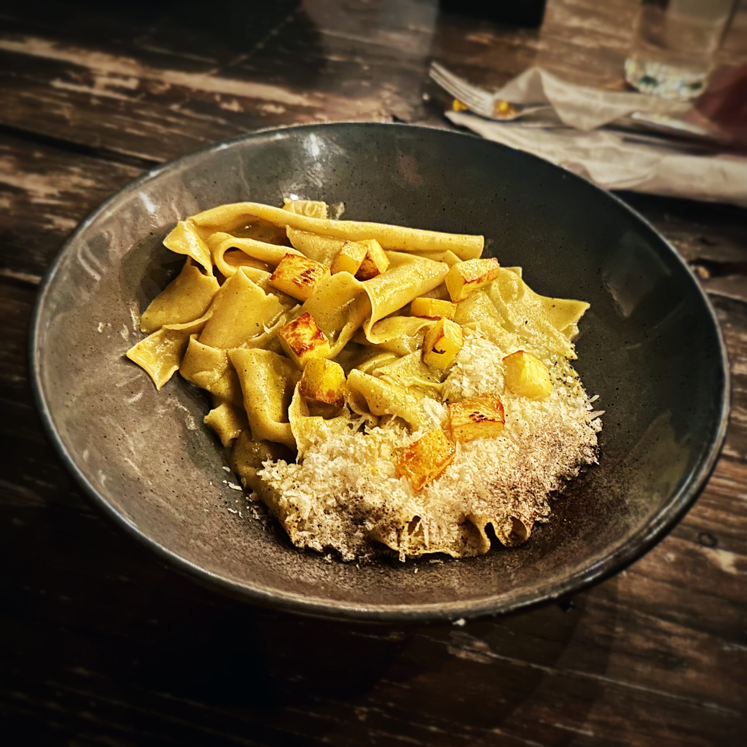 Pappardelle con zucca locale, basilico, pesto di noci e Grana Padano