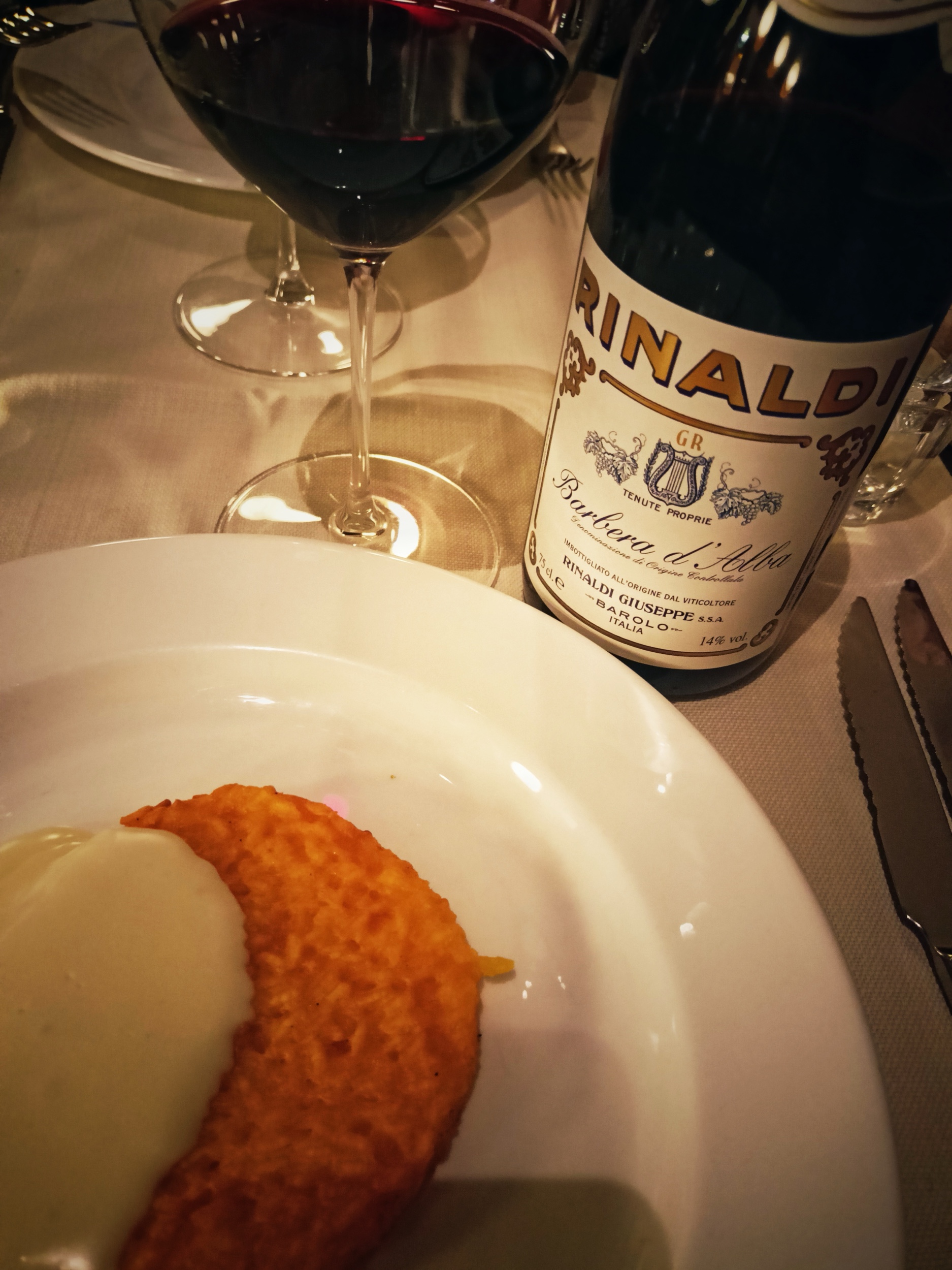 Nonostante l’ampia e ricercata carta dei vini (con prezzi a partire da 25,00 euro), avevamo già in mente di stappare un vino della Giuseppe Rinaldi, forse una freisa, ma essendo esaurita, la scelta è ricaduta sulla sua Barbera d’Alba 2020, un vino espressivo delle Langhe, dritto, con profumi di sottobosco, speziato e bello fresco al palato: non c’erano dubbi sul fatto che si sposasse bene col cibo ordinato.