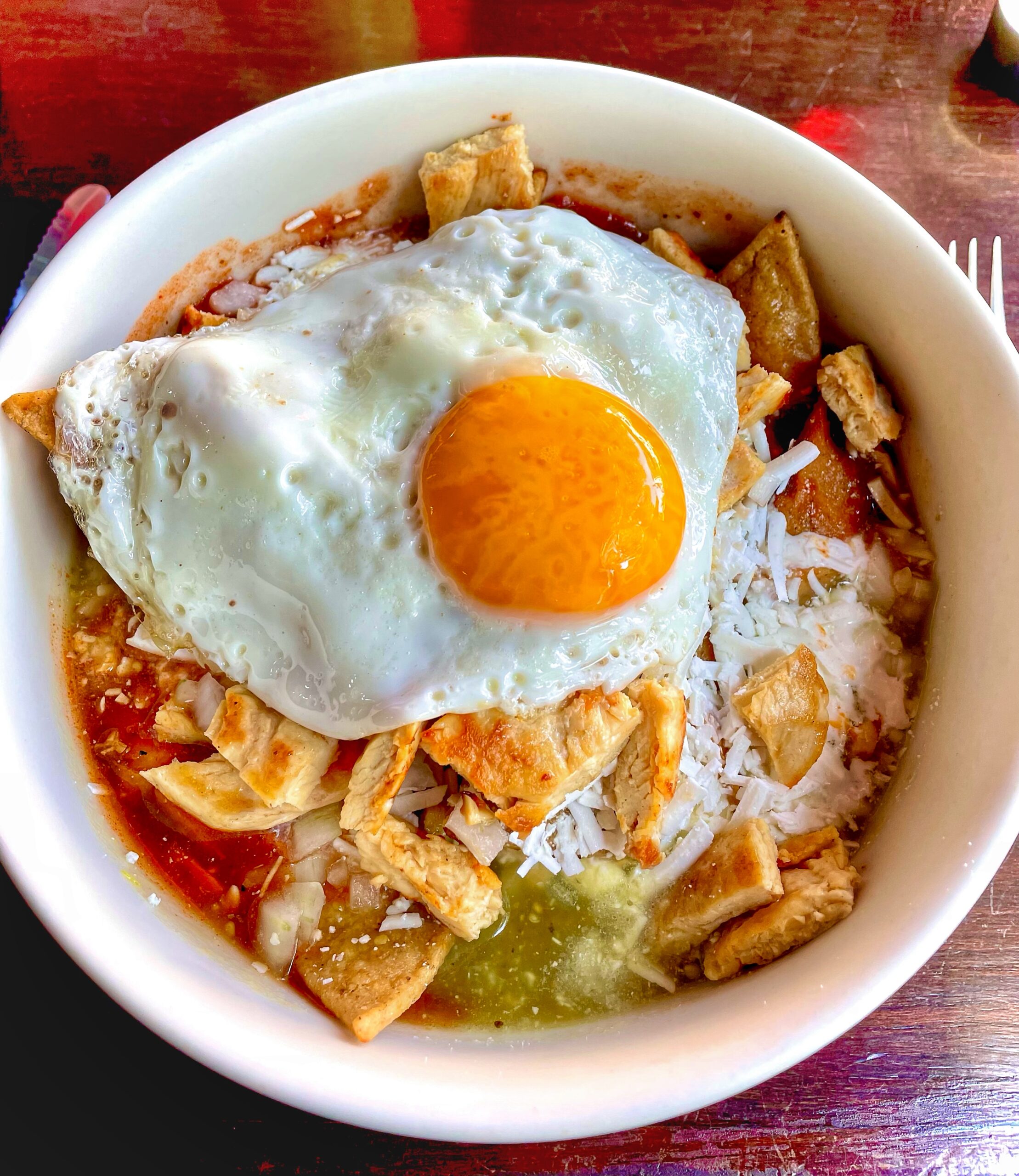 Chilaquiles “divorciados”, con salsa verde e rossa.