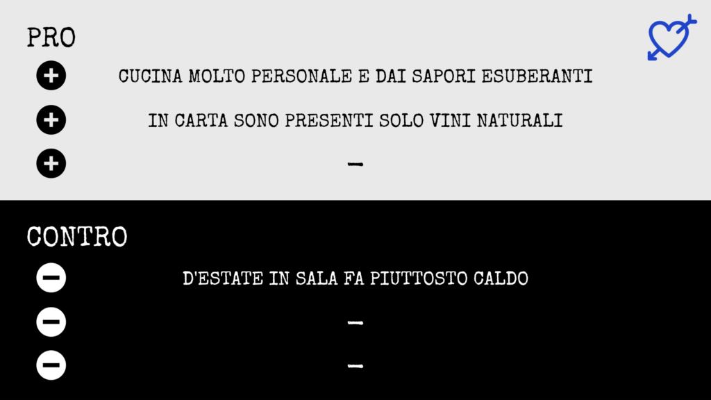 Sulla carta dei vini niente da dire, solo belle bottiglie naturali. Si beve bene a partire dai 22,00 euro chiesti per il Grechetto di Raina o dai 23,00 per il classicissimo Renosu rosso delle Tenute Dettori.