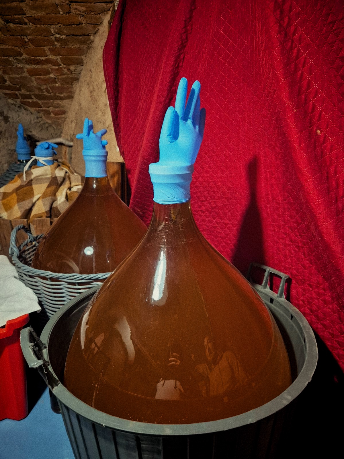 Scendiamo nella cantina piccola, ordinatissima, essenziale e fredda. Una vasca in acciaio e una in vetroresina, damigiane per affinare.