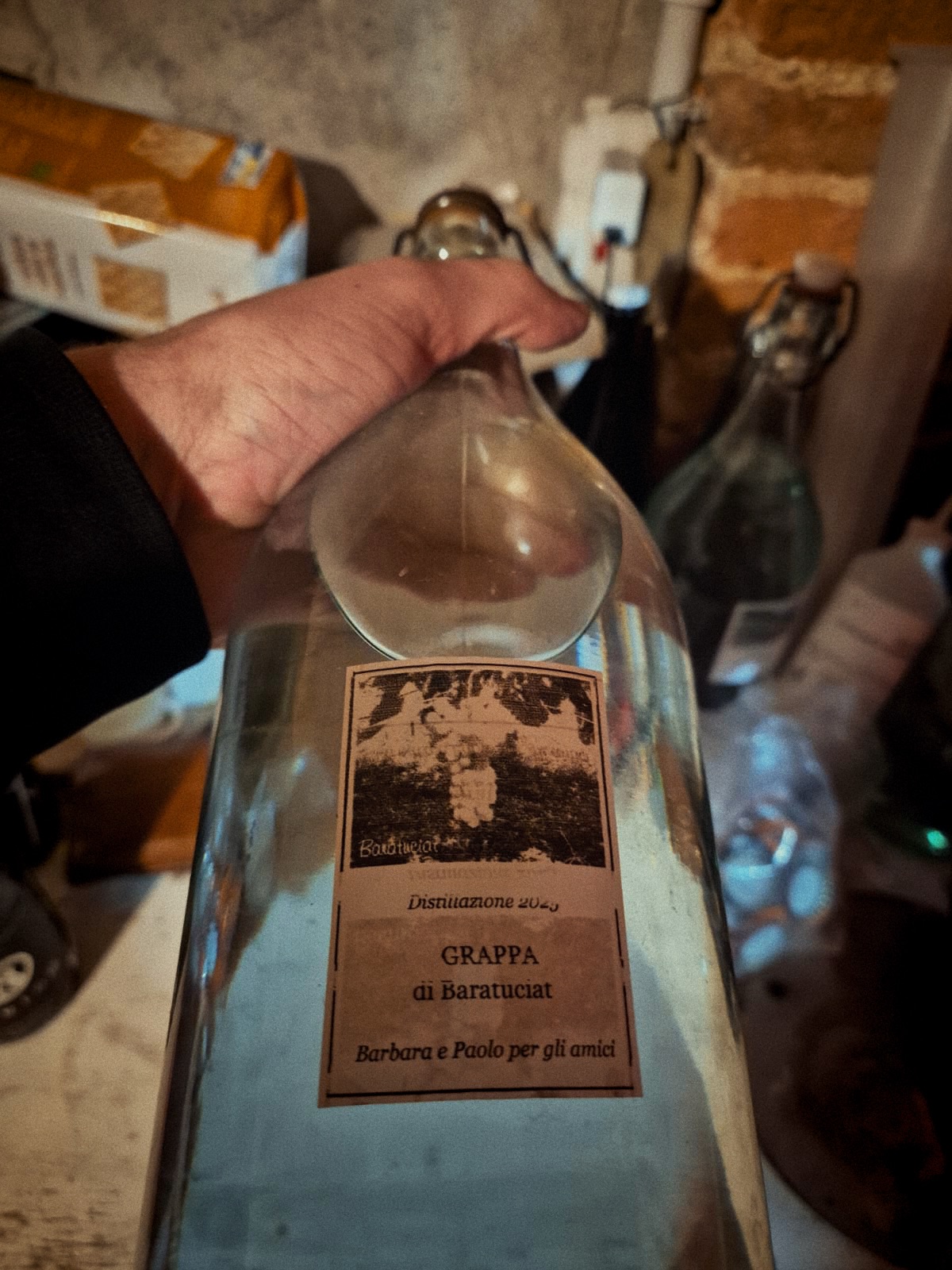 La produzione microscopica destinata all’auto-consumo, a pochi locali in Italia e agli importatori californiani. La grappa.